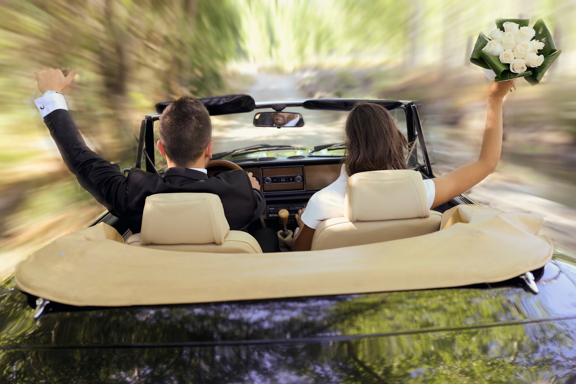 Un chico con un traje y una chica con un ramo corren en un convertible