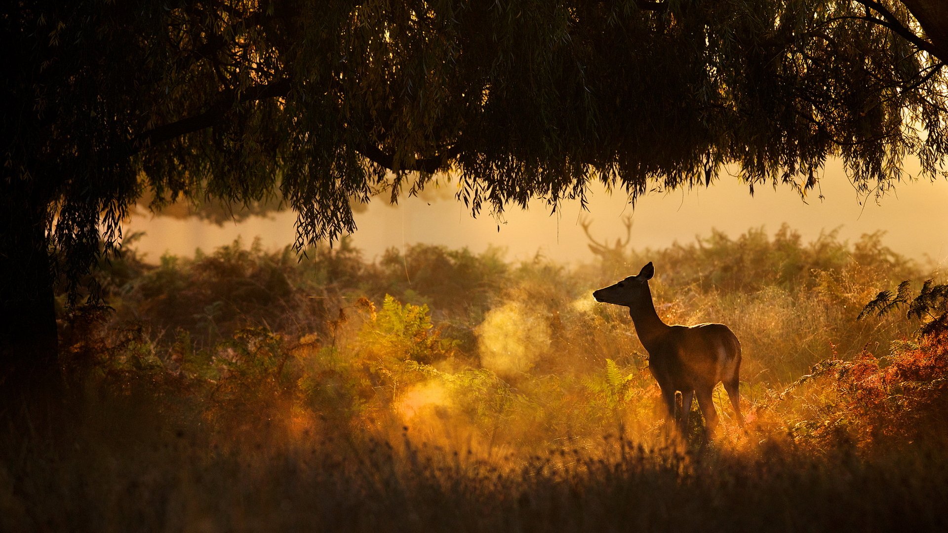 Un ciervo solitario al atardecer junto a un árbol