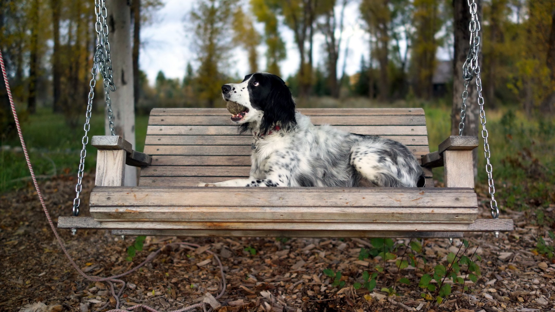 Perro acostado en un columpio con un juguete en los dientesPerro acostado en un columpio con un juguete en los dientes