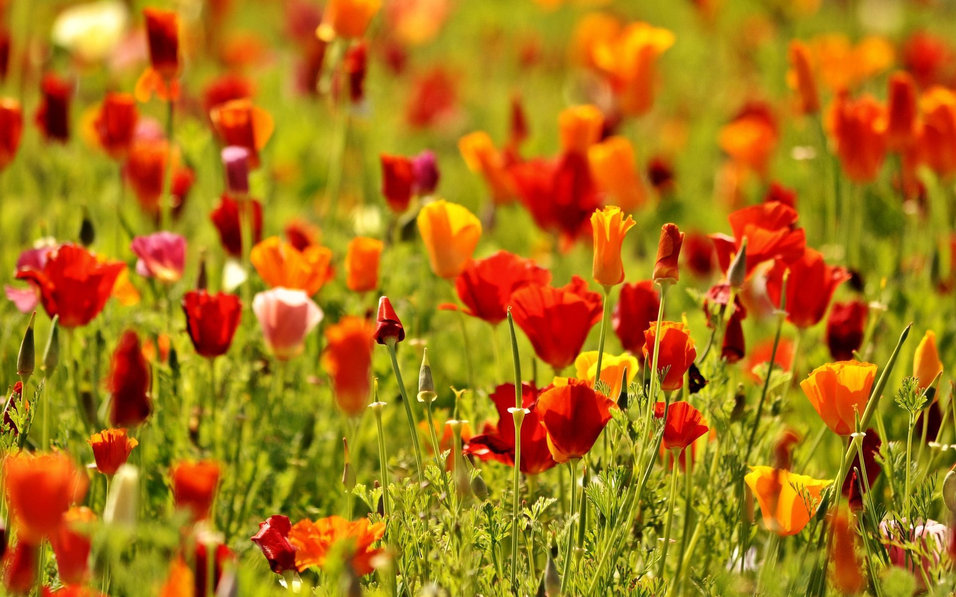 Campo de amapolas rojas y naranjas