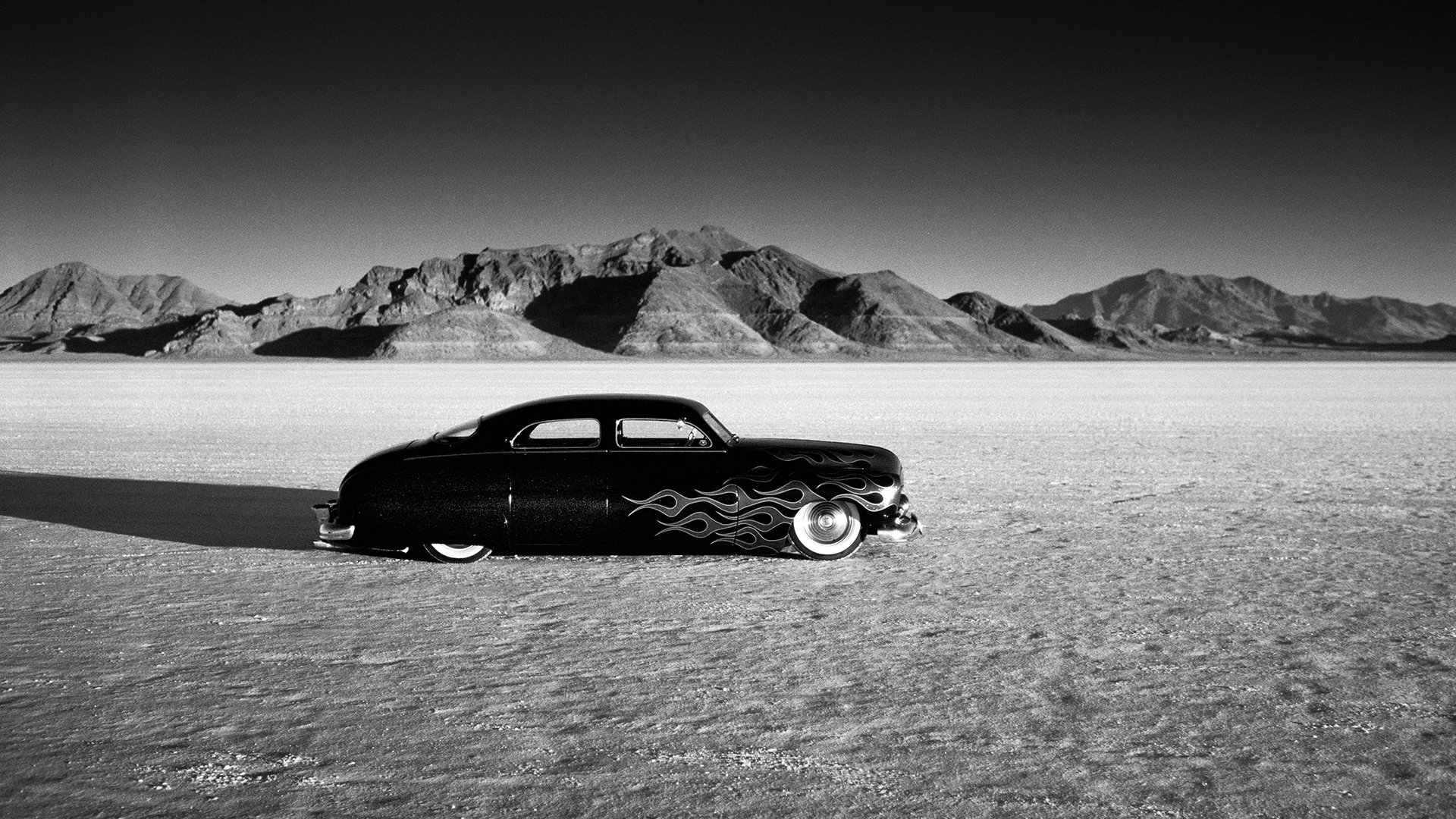 Foto en blanco y negro con un coche de carreras en el fondo de las montañas