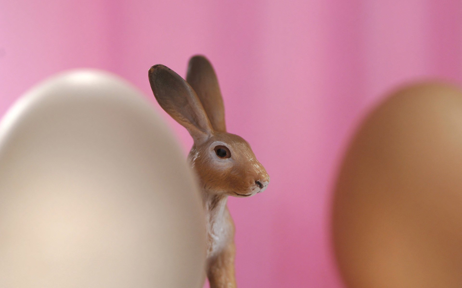 El conejo de pascua se asoma por detrás de un huevoEl conejo de Pascua se asoma por detrás de un huevo