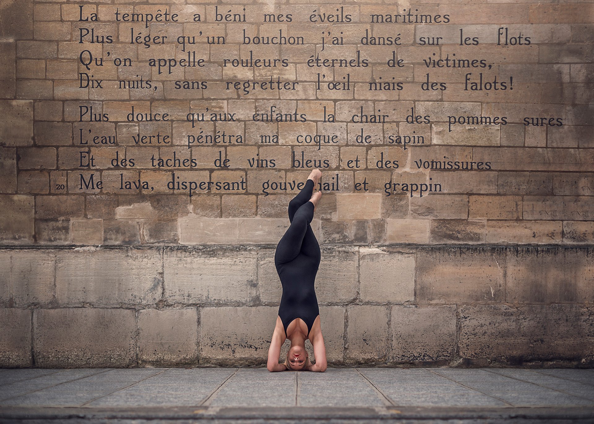 Bailarina en pose contra una pared de fondo con versosBailarina en pose contra una pared de fondo con versos