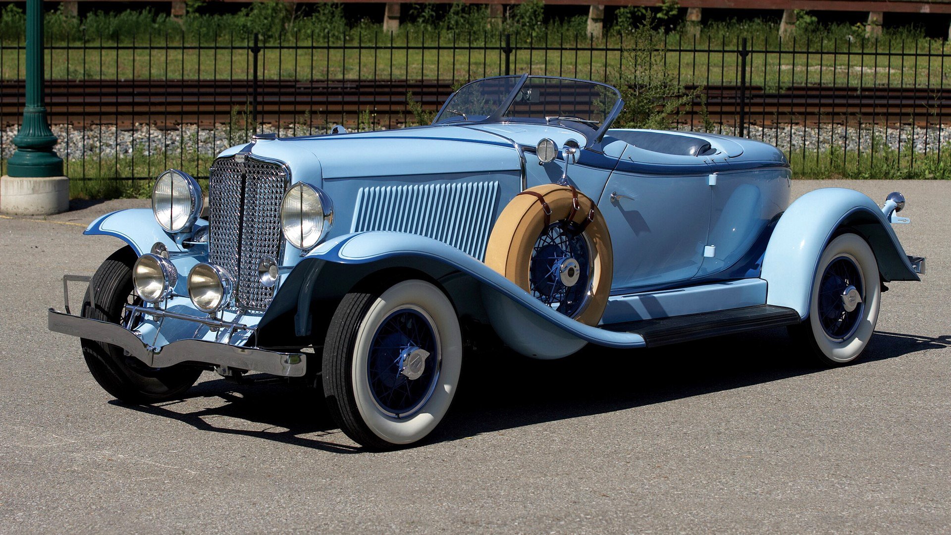 Coche retro en la ciudad en medio de la hierba verde en el parque