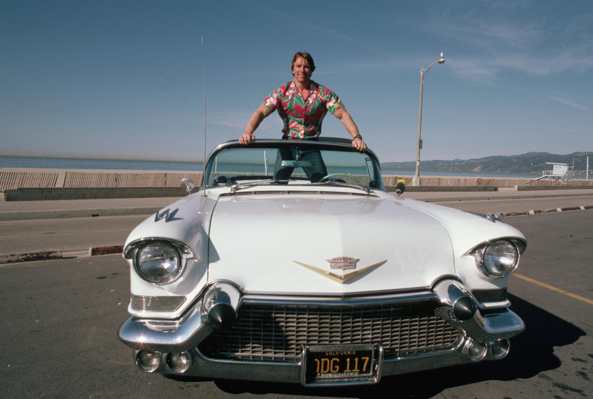 Terminator se encuentra en un convertible blanco