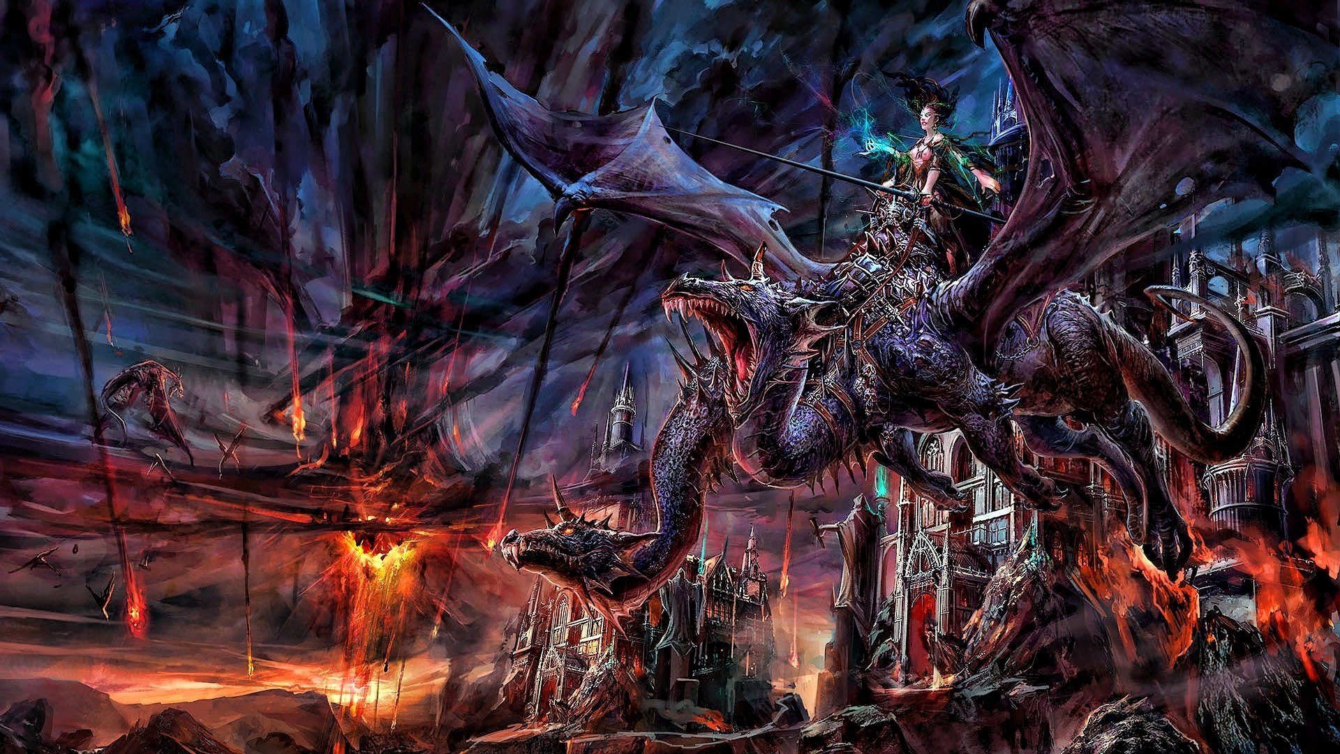 Dibujo de un dragón de dos cabezas con una jinete entre las llamas y el castilloDibujo de un dragón de dos cabezas con una jinete entre las llamas y el castillo