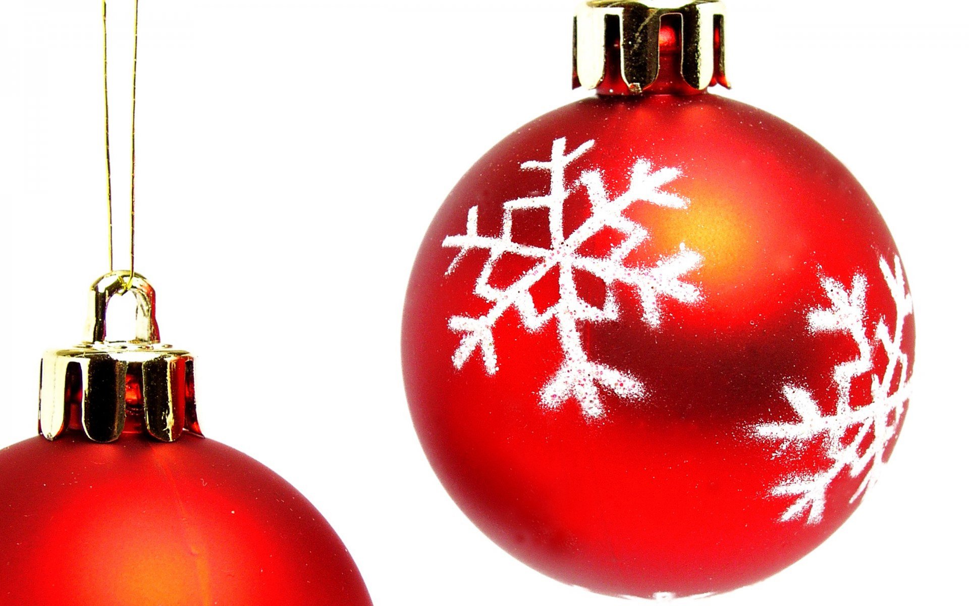 Bolas rojas de navidad sobre un fondo azul con copos de nieveBolas rojas de Navidad sobre un fondo azul con copos de nieve