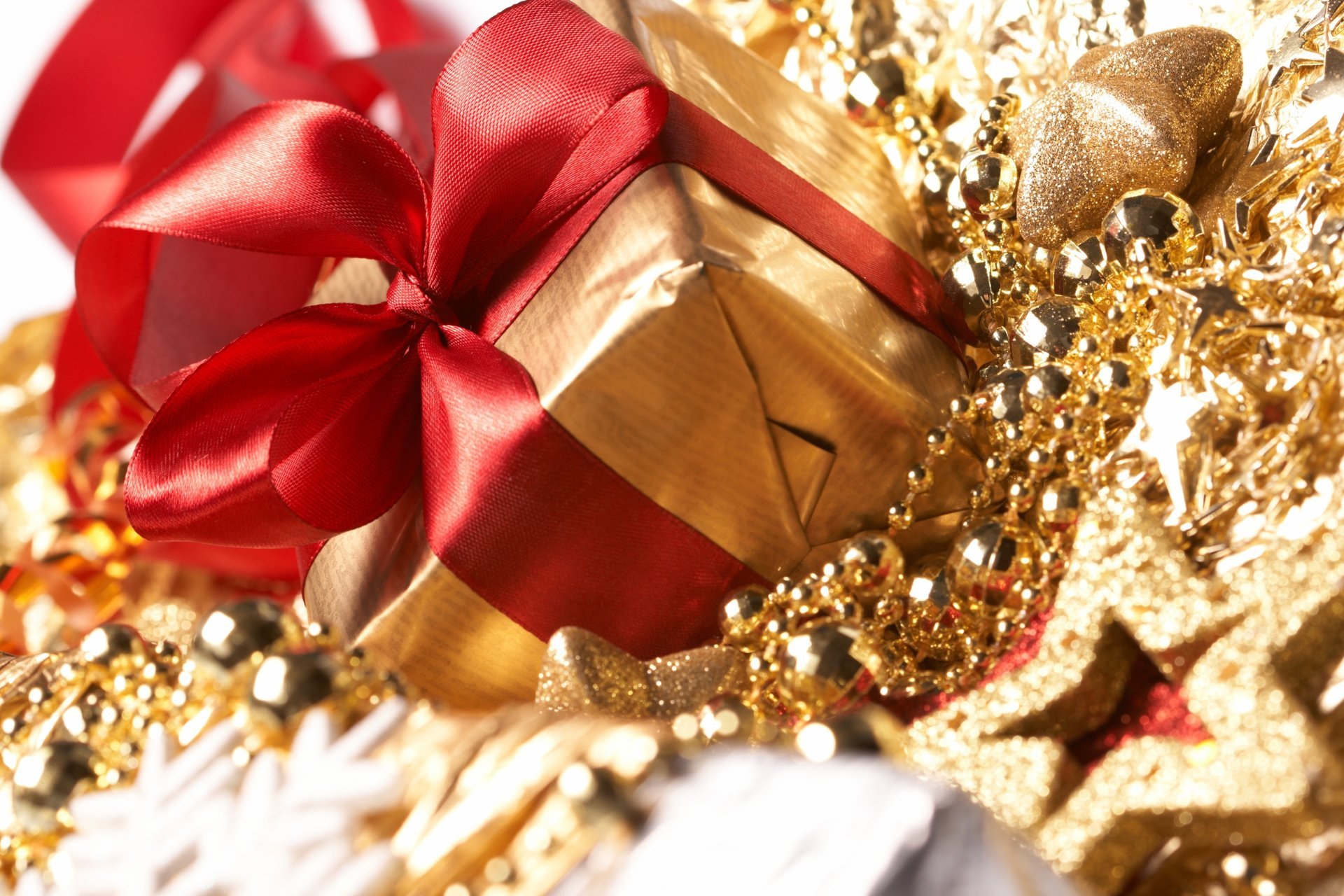 Tarjeta, decorada con una cinta roja y dorada, atada en un arco, para año Nuevo o Navidad