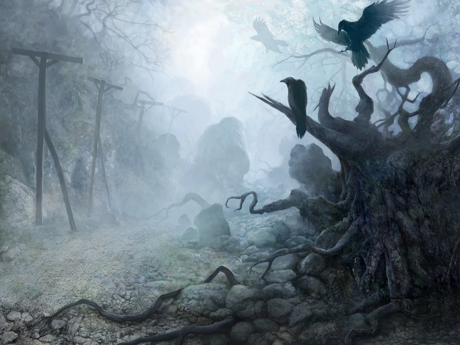 Objeto de arte-cementerio sombrío mágico con una bandada de cuervosObjeto de arte-cementerio sombrío mágico con una bandada de cuervos