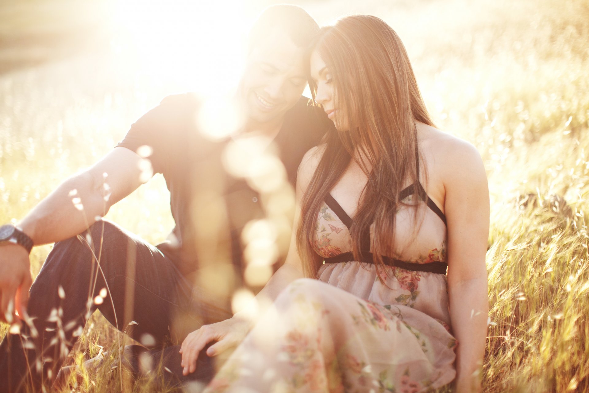 Una pareja de enamorados posa para una foto en un campo con cereales contra el solUna pareja de enamorados posa para una foto en un campo con cereales contra el sol