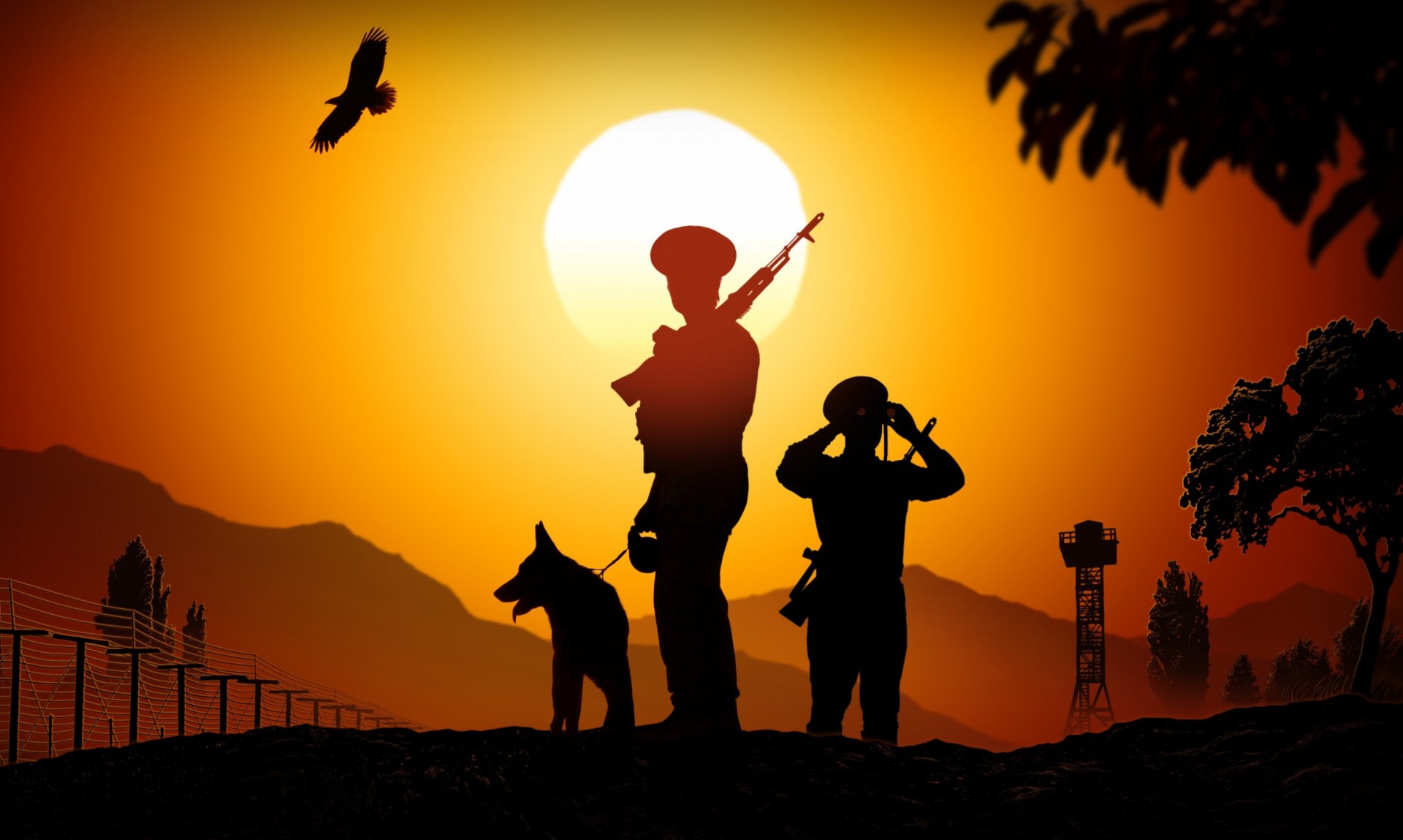 Guardias fronterizos con un perro al atardecer