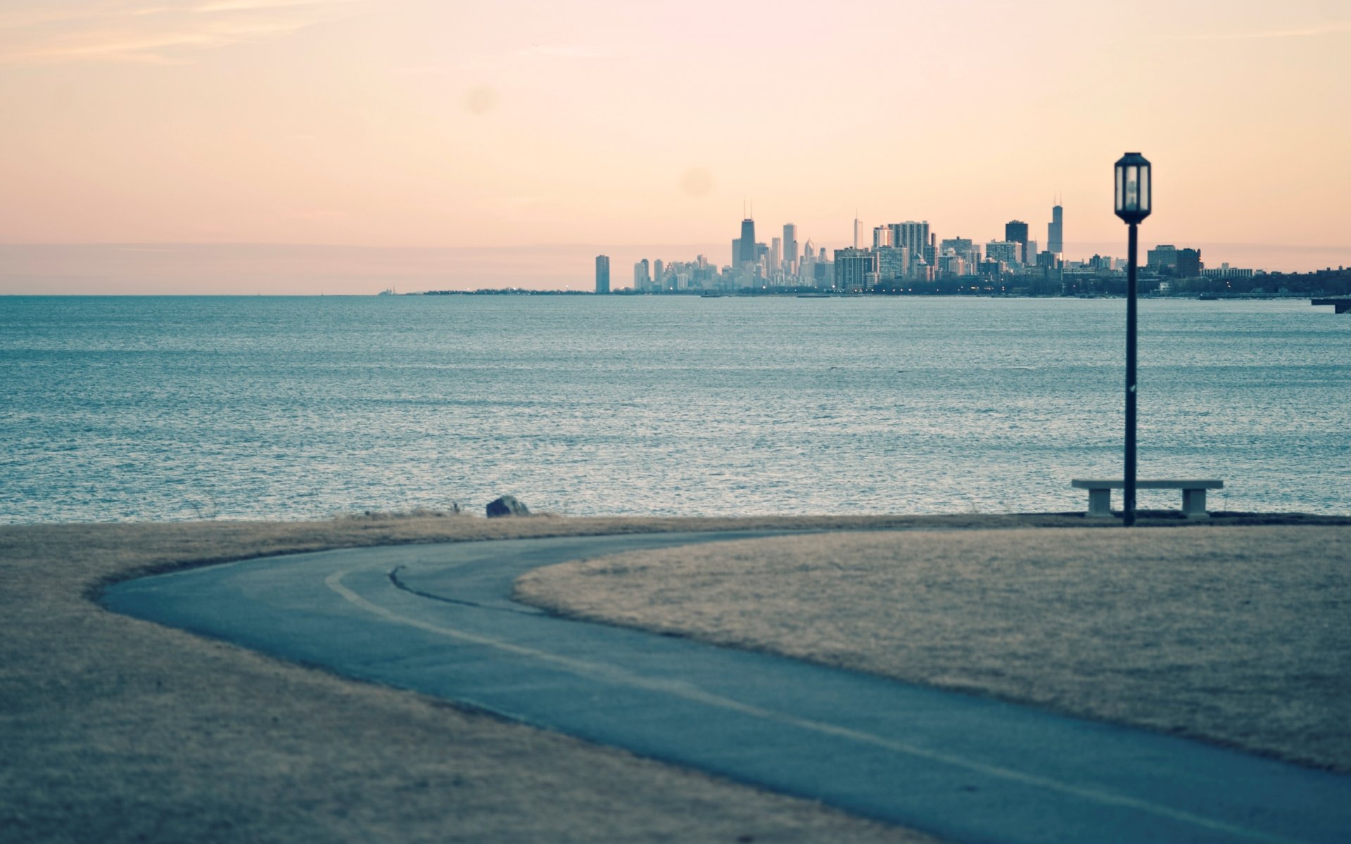 Camino con un banco en el fondo de un estanque con rascacielos