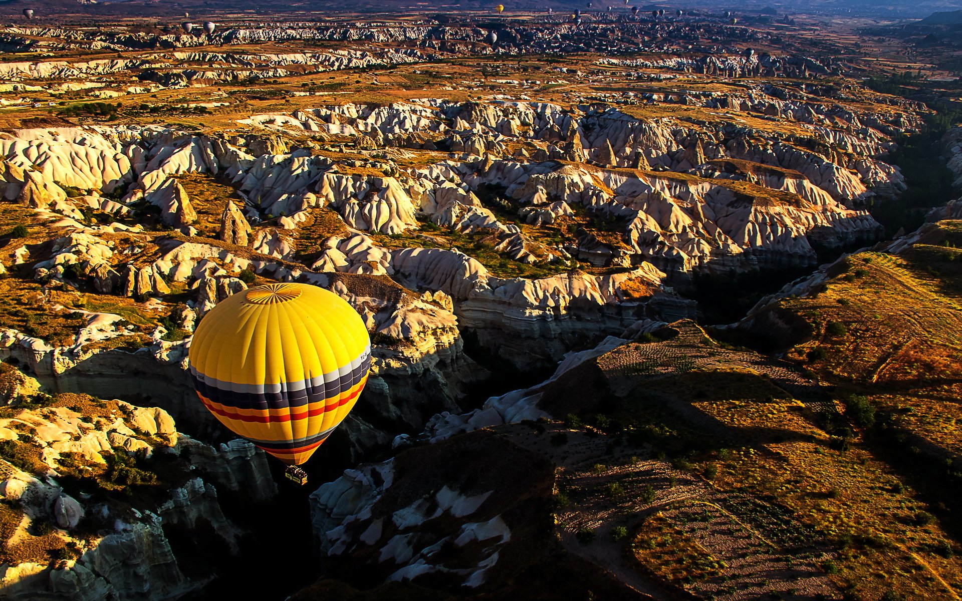 En algún lugar de las montañas hay un cielo azul cubierto de globos