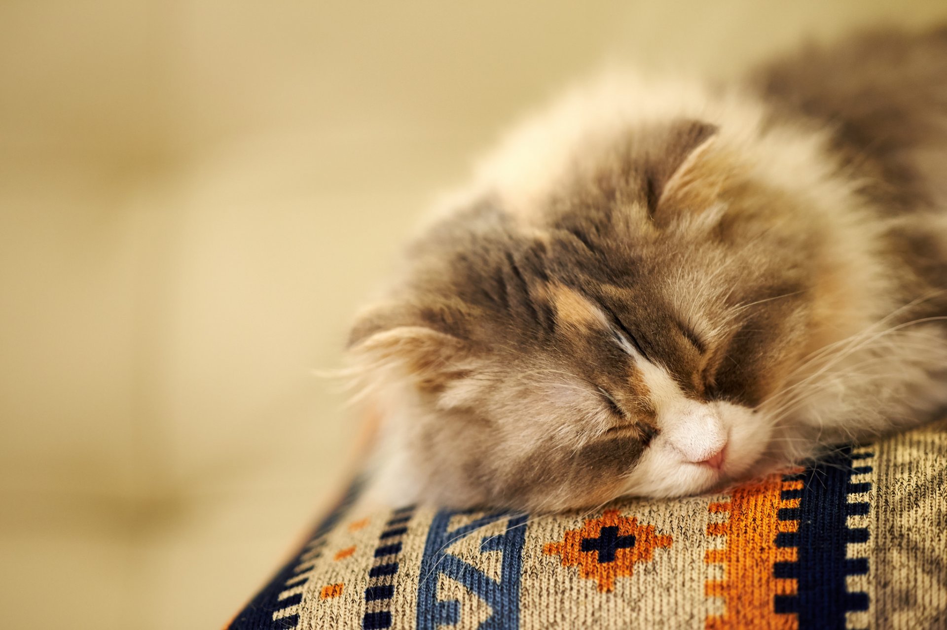 Gato peludo duerme pacíficamente en una almohada de colorGato peludo duerme pacíficamente en una almohada de color