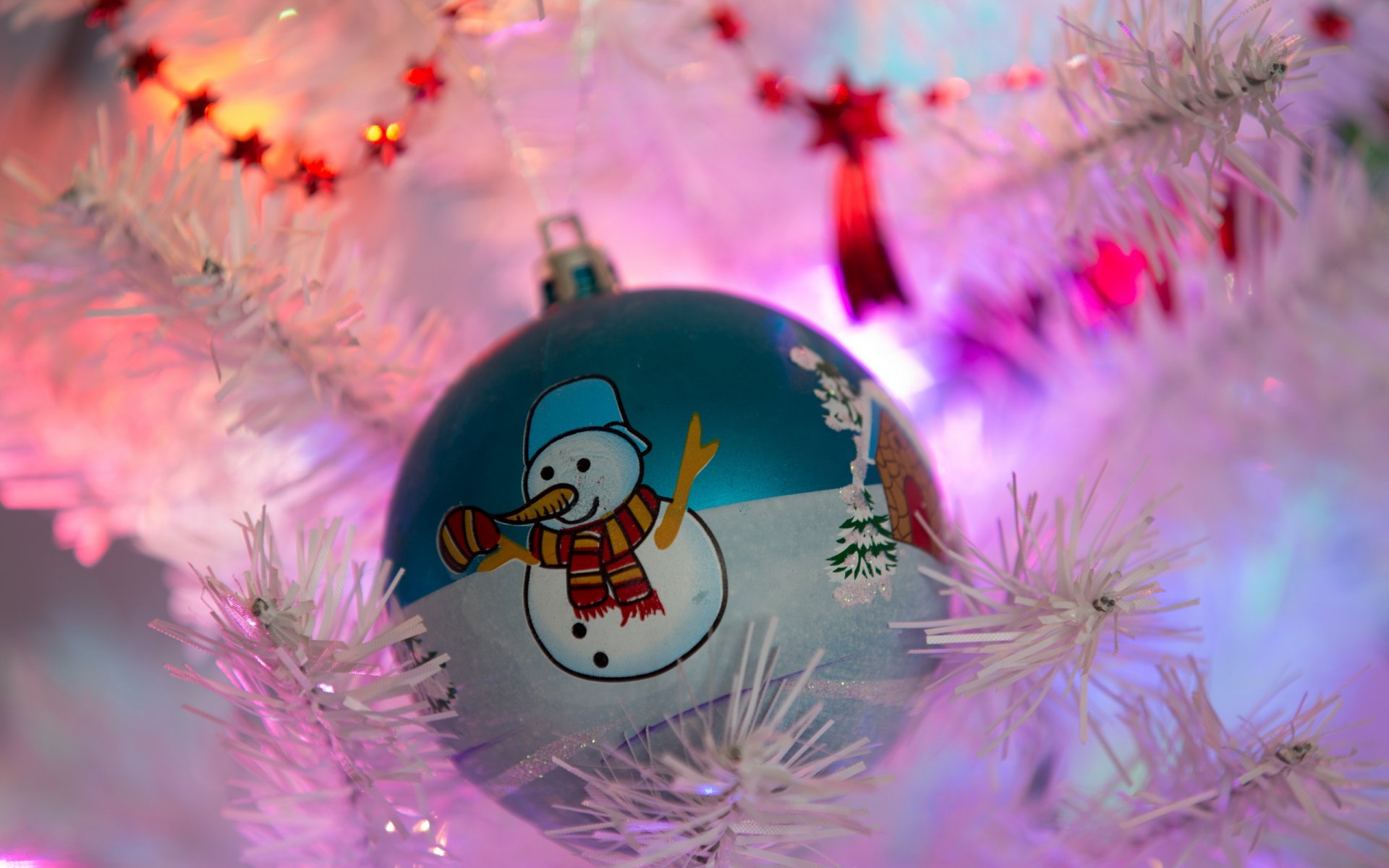 Bola de juguete de navidad con muñeco de nieve, colgando en el árbol de navidad blancoBola de juguete de Navidad con muñeco de nieve, colgando en el árbol de Navidad blanco