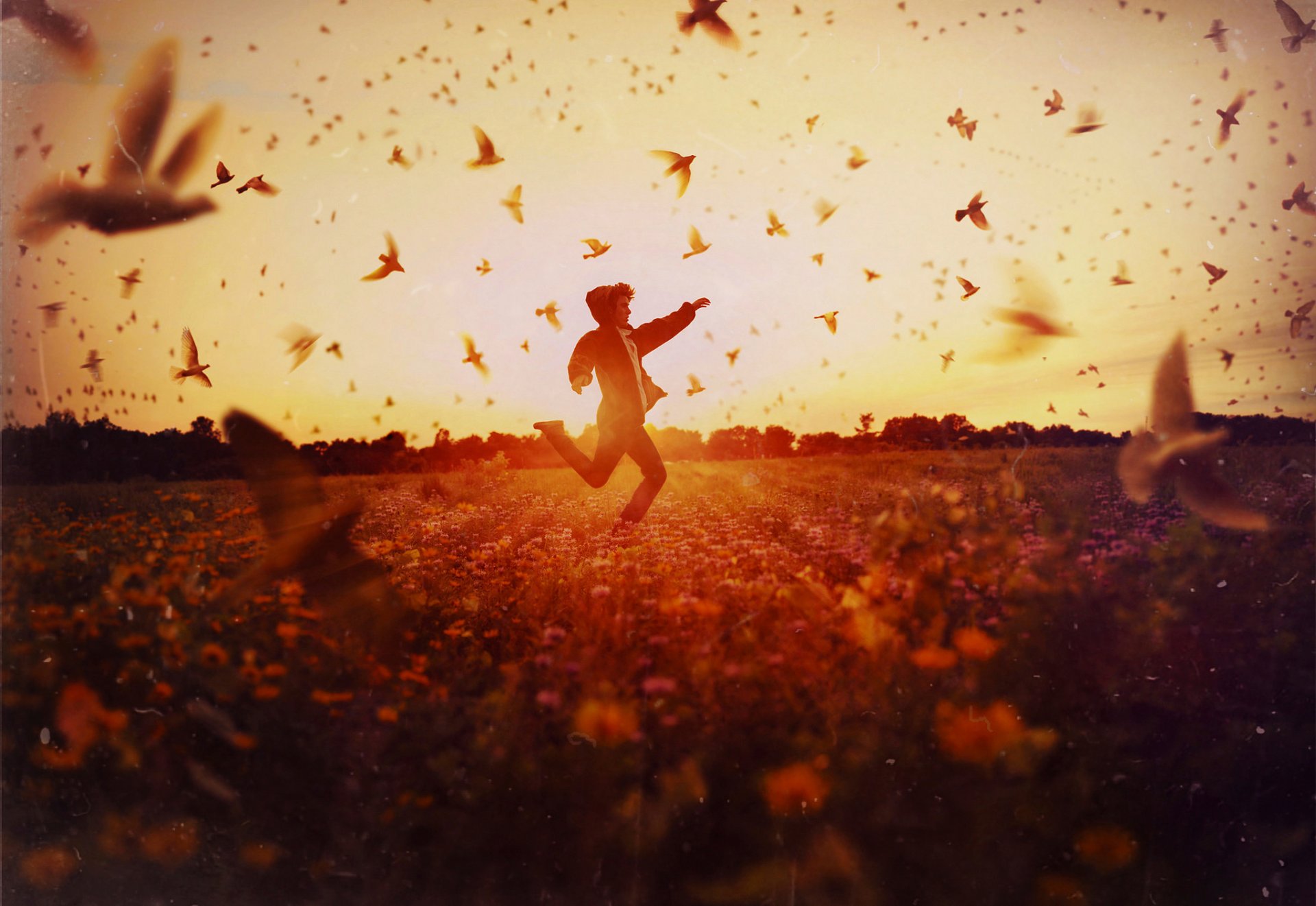 Un chico iluminado por el sol corre por el campo dispersando a los pájarosUn chico iluminado por el sol corre por el campo dispersando a los pájaros