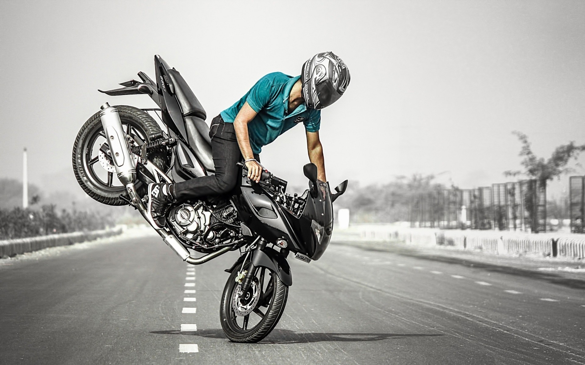 Un motociclista hace un truco peligroso en una motocicleta negra en medio de la carreteraUn motociclista hace un truco peligroso en una motocicleta negra en medio de la carretera