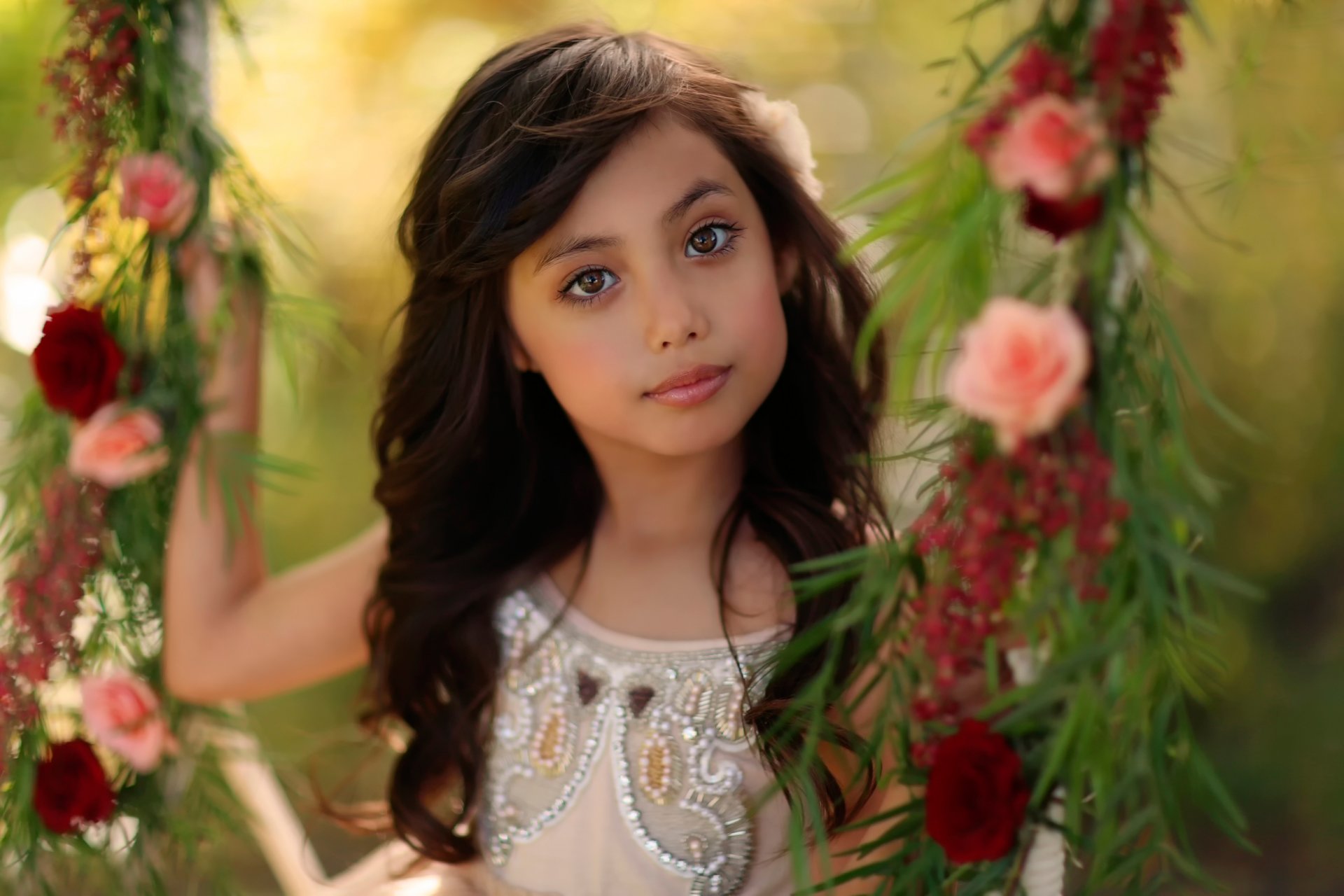 Niña en un columpio bellamente decorado con floresNiña en un columpio bellamente decorado con flores