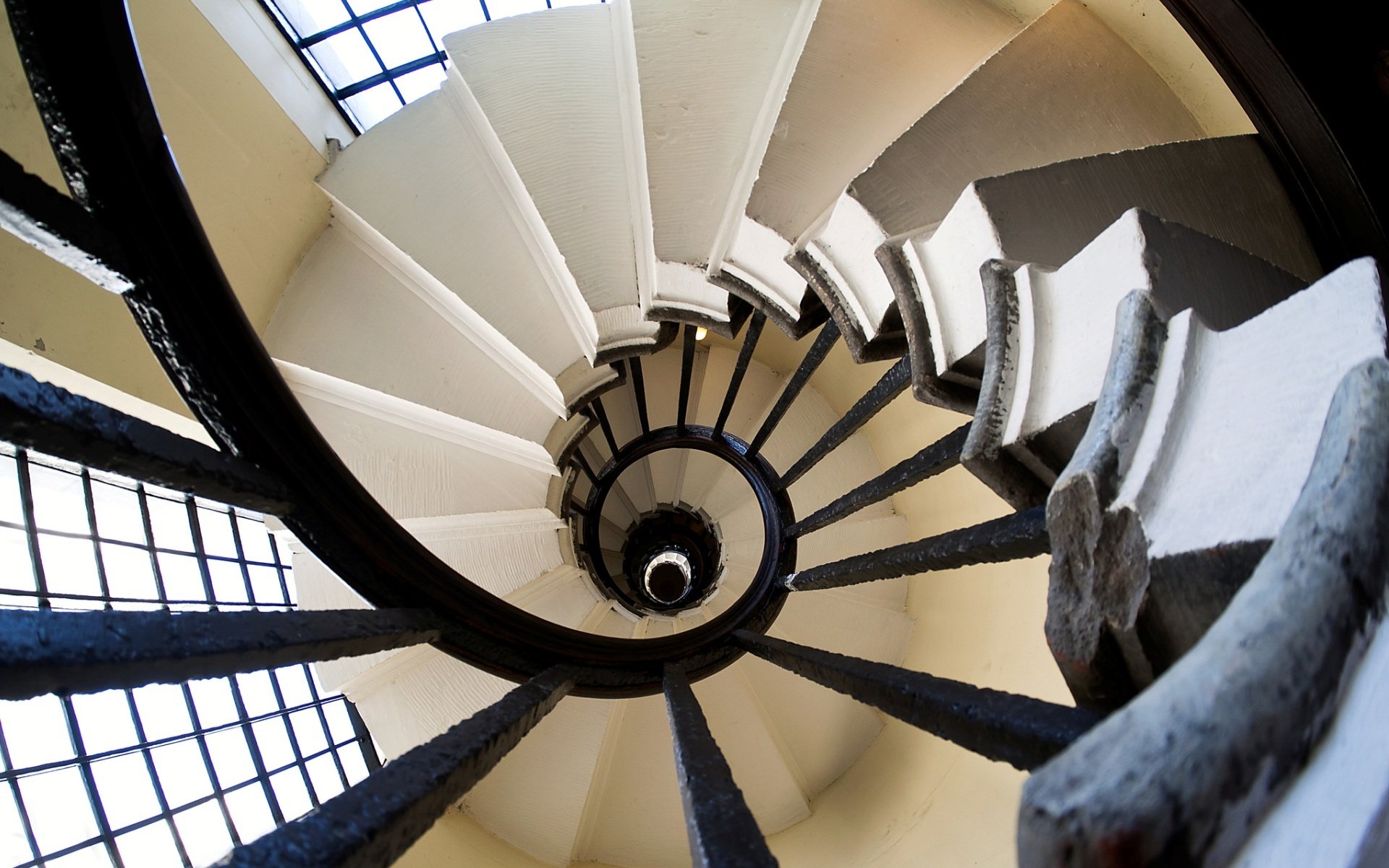 Vista superior de una larga escalera de caracol con barandas caladasVista superior de una larga escalera de Caracol con barandas caladas