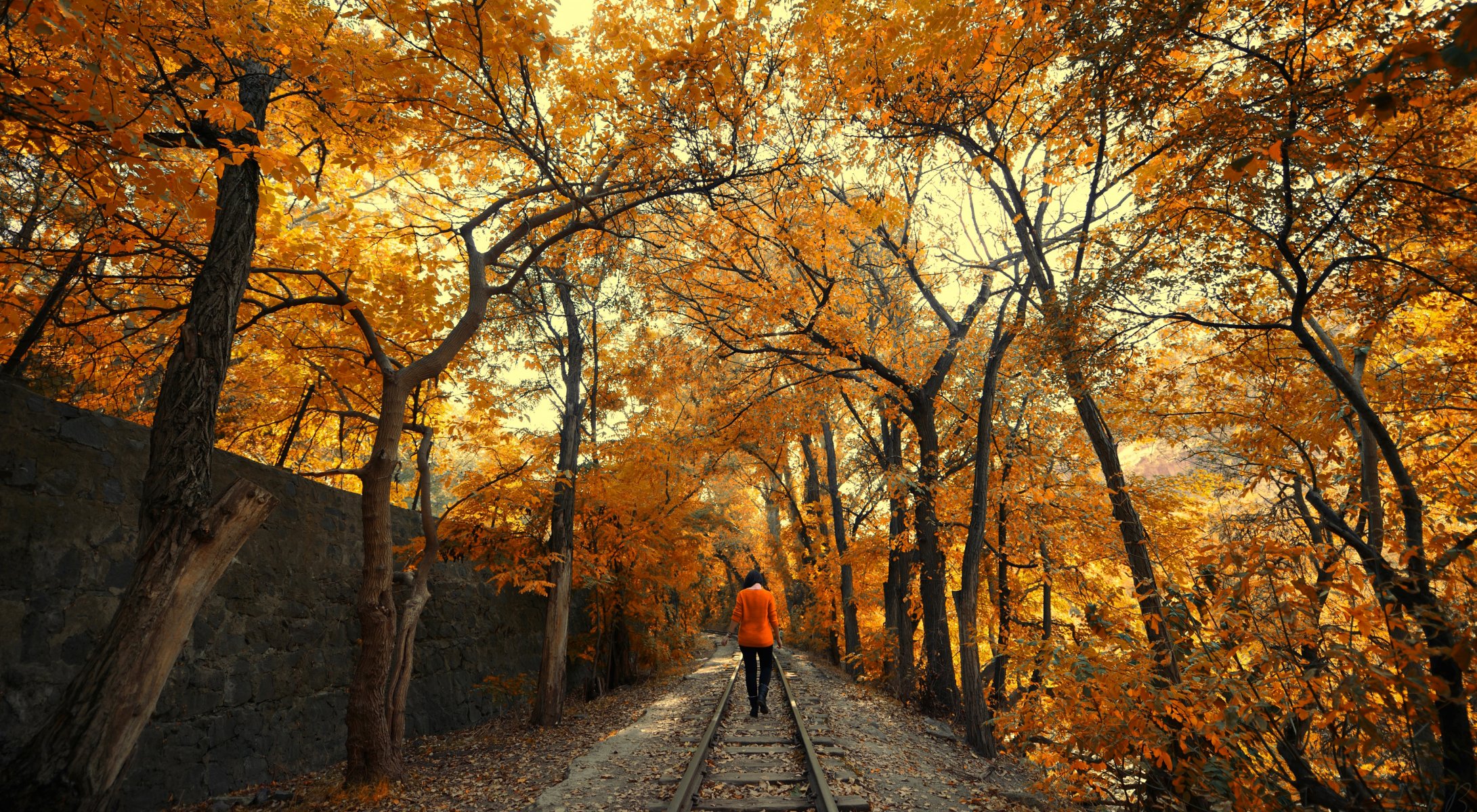 Una niña camina por las vías en un parque de otoñoUna niña camina por las vías en un parque de otoño