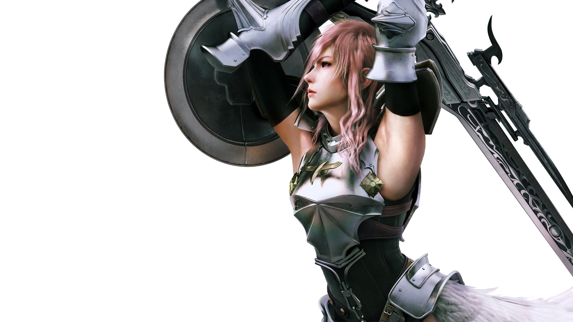 Una chica con un escudo y una espada sobre un fondo blancoUna chica con un escudo y una espada sobre un fondo blanco