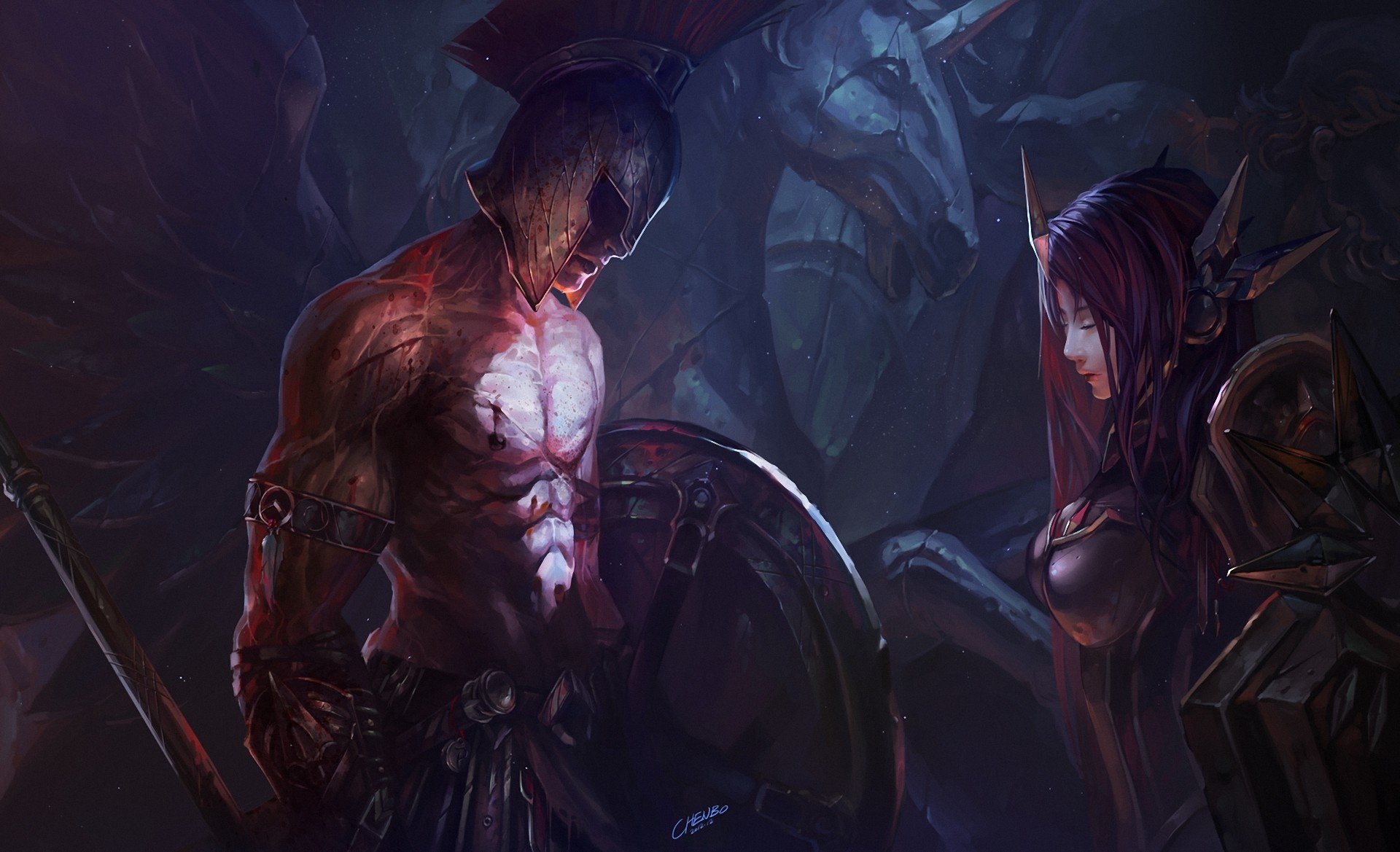 Guerrero con armadura de hierro con una espada y un escudo en el fondo de un bosque de nieblaGuerrero con armadura de hierro con una espada y un escudo en el fondo de un bosque de niebla