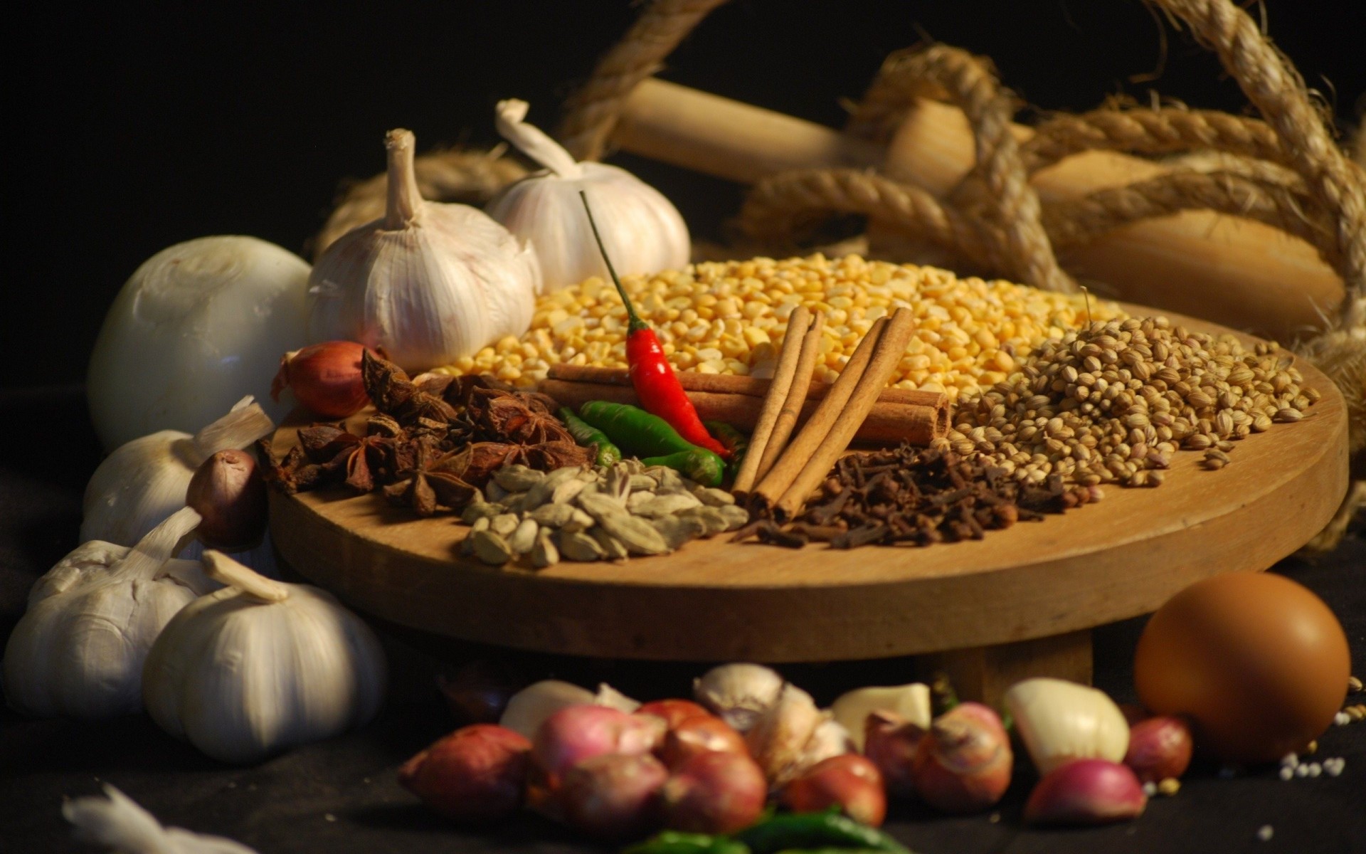 Pimientos, verduras y especias en una mesa de maderaPimientos, verduras y especias en una mesa de madera