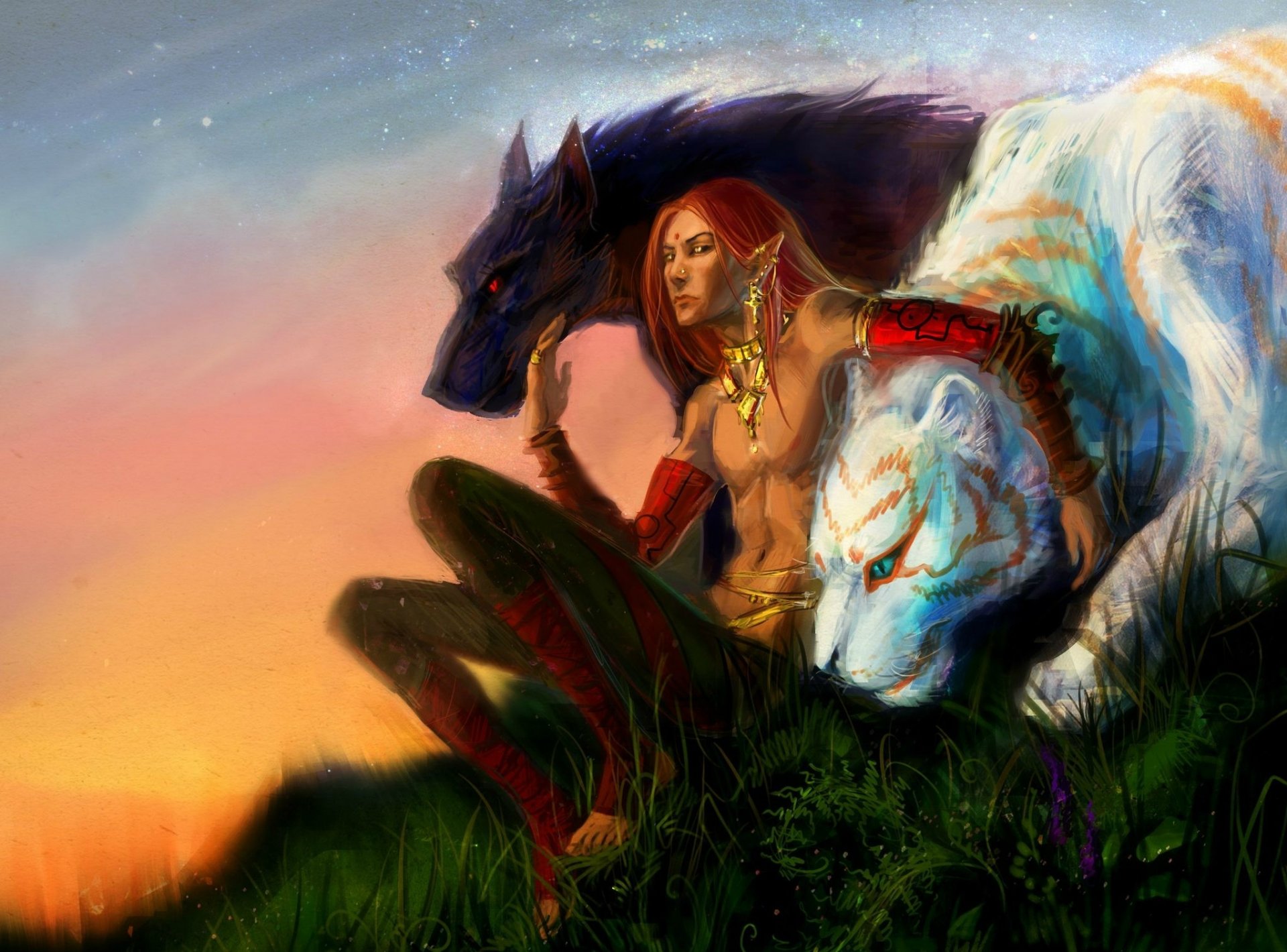 El arte de un duende acompañado de bestias en forma de un tigre blanco y un lobo negro con ojos rojosEl arte de un duende acompañado de bestias en forma de un tigre blanco y un lobo negro con ojos rojos