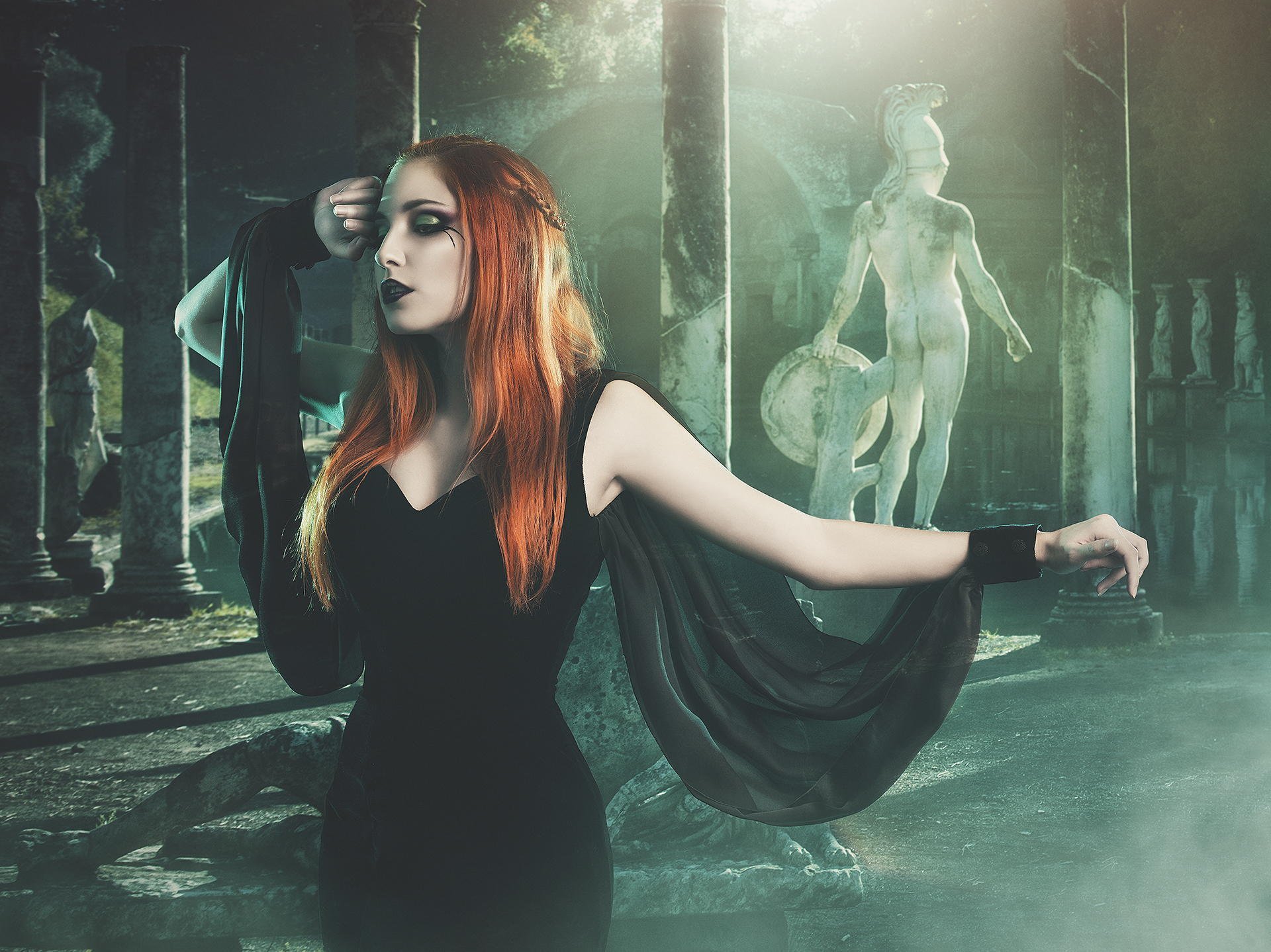 La chica de negro en el fondo de la estatua