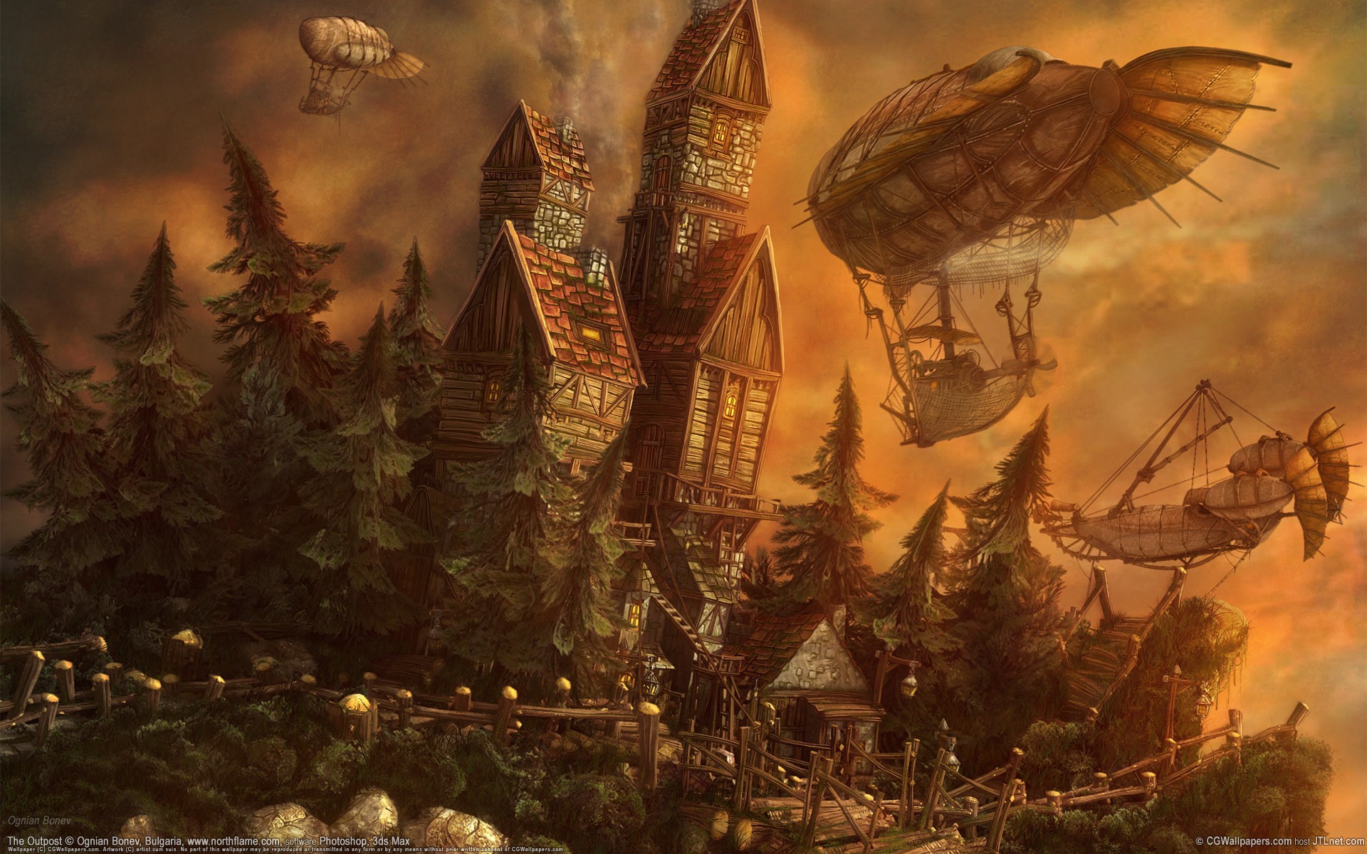 Una cabaña de cuento de hadas, y los dirigibles vuelan alrededorUna cabaña de cuento de hadas, y los dirigibles vuelan alrededor