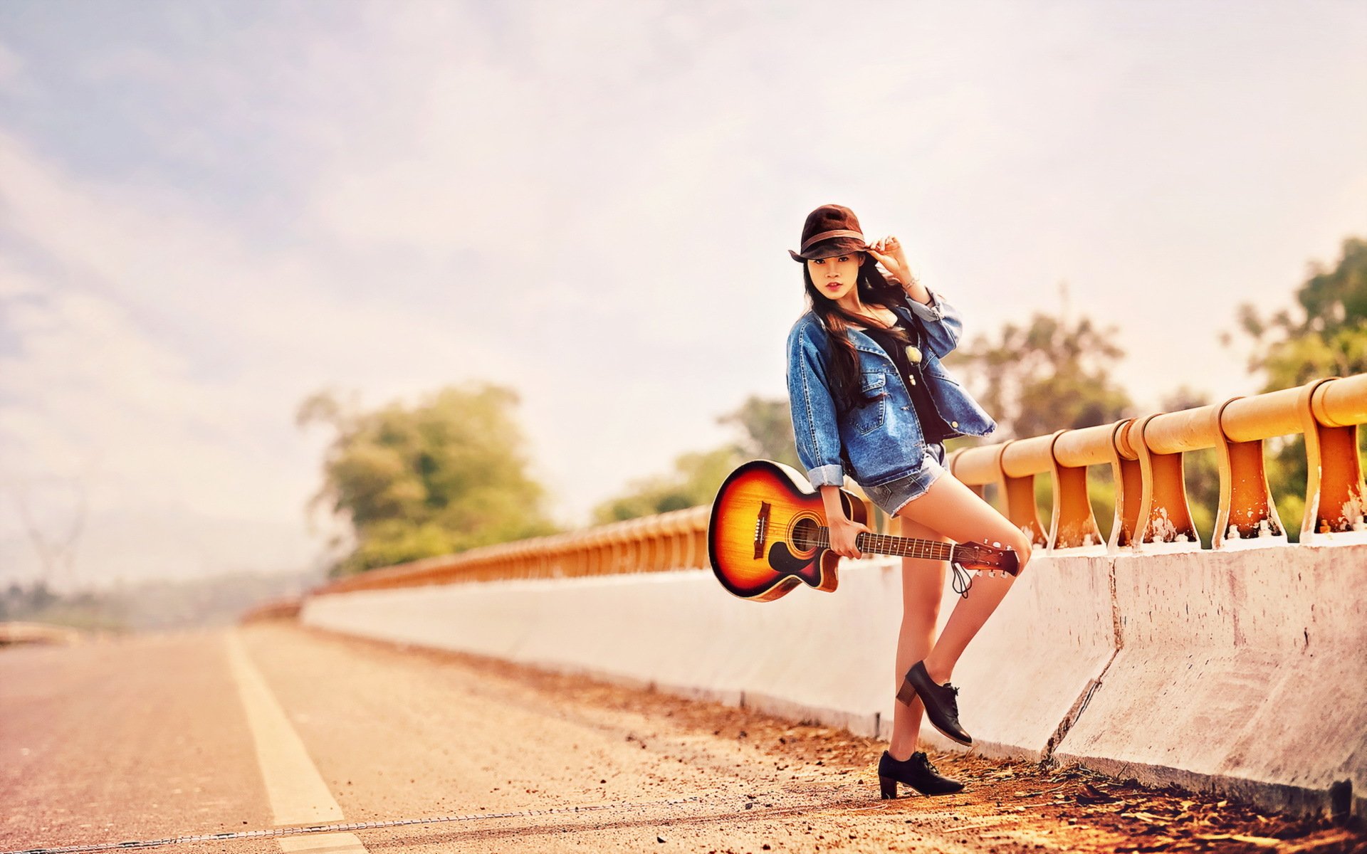Un chico y una chica con una guitarra miran a un opel de pie en la playaUn chico y una chica con una guitarra miran a un opel de pie en la playa