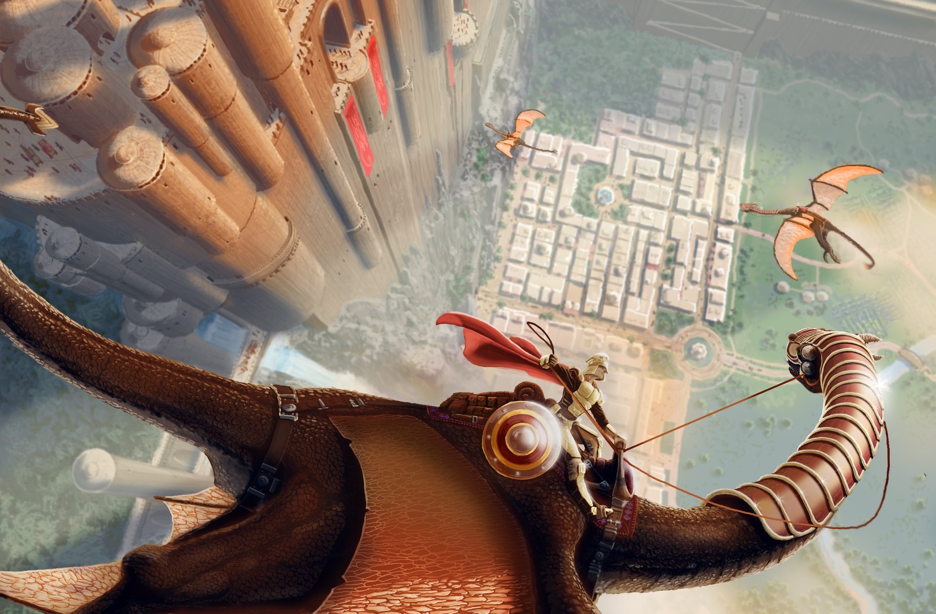 Fantasía: el vuelo de un jinete con armadura en un dragónFantasía: el vuelo de un jinete con armadura en un dragón