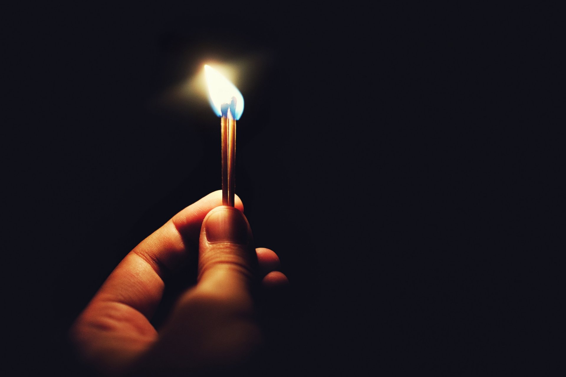 Fósforos ardientes en la mano en la oscuridad totalFósforos ardientes en la mano en la oscuridad total