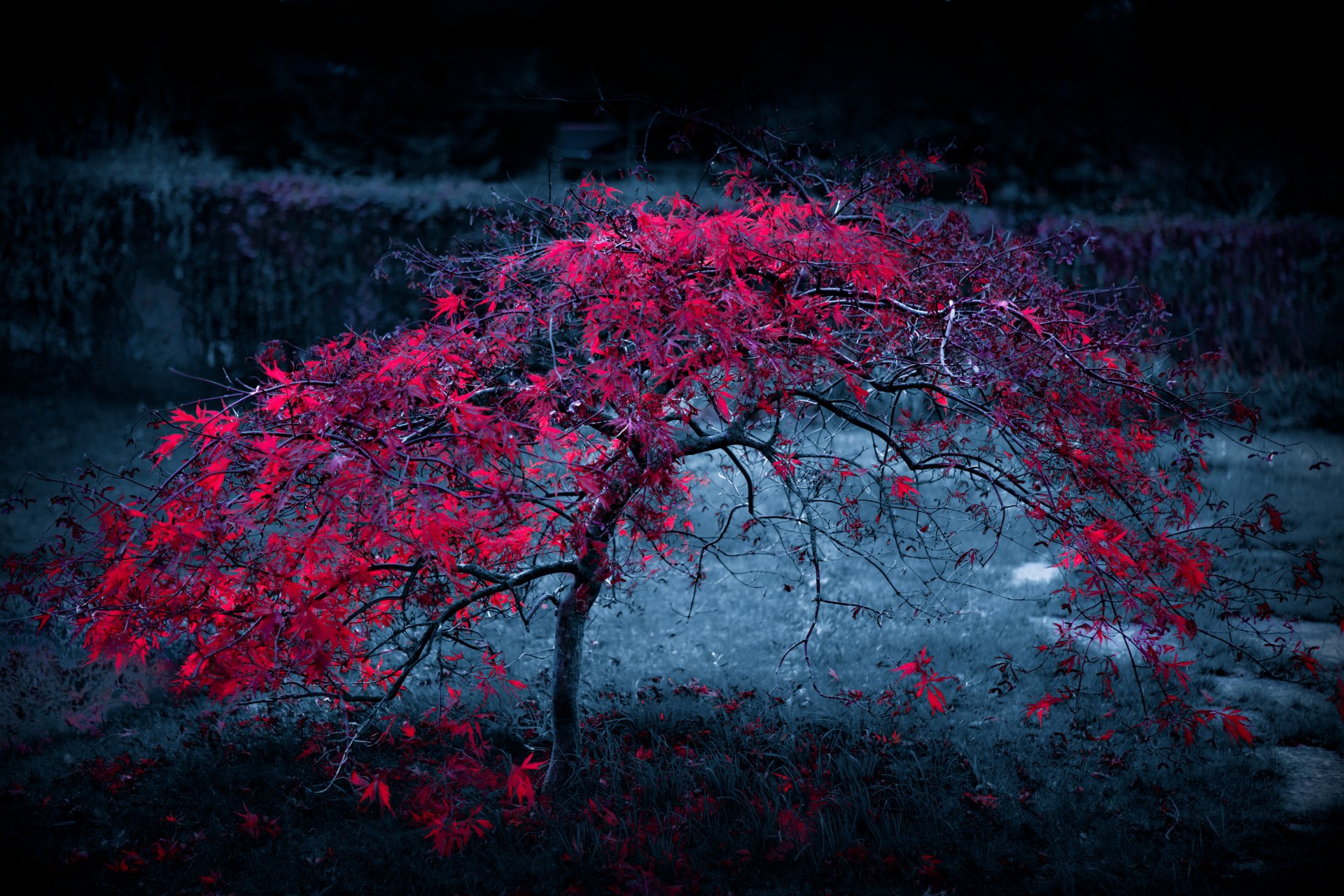 Troncos de árboles desnudos, alfombras de hojas marchitas crean un ambiente de bosque sombríoTroncos de árboles desnudos, alfombras de hojas marchitas crean un ambiente de bosque sombrío