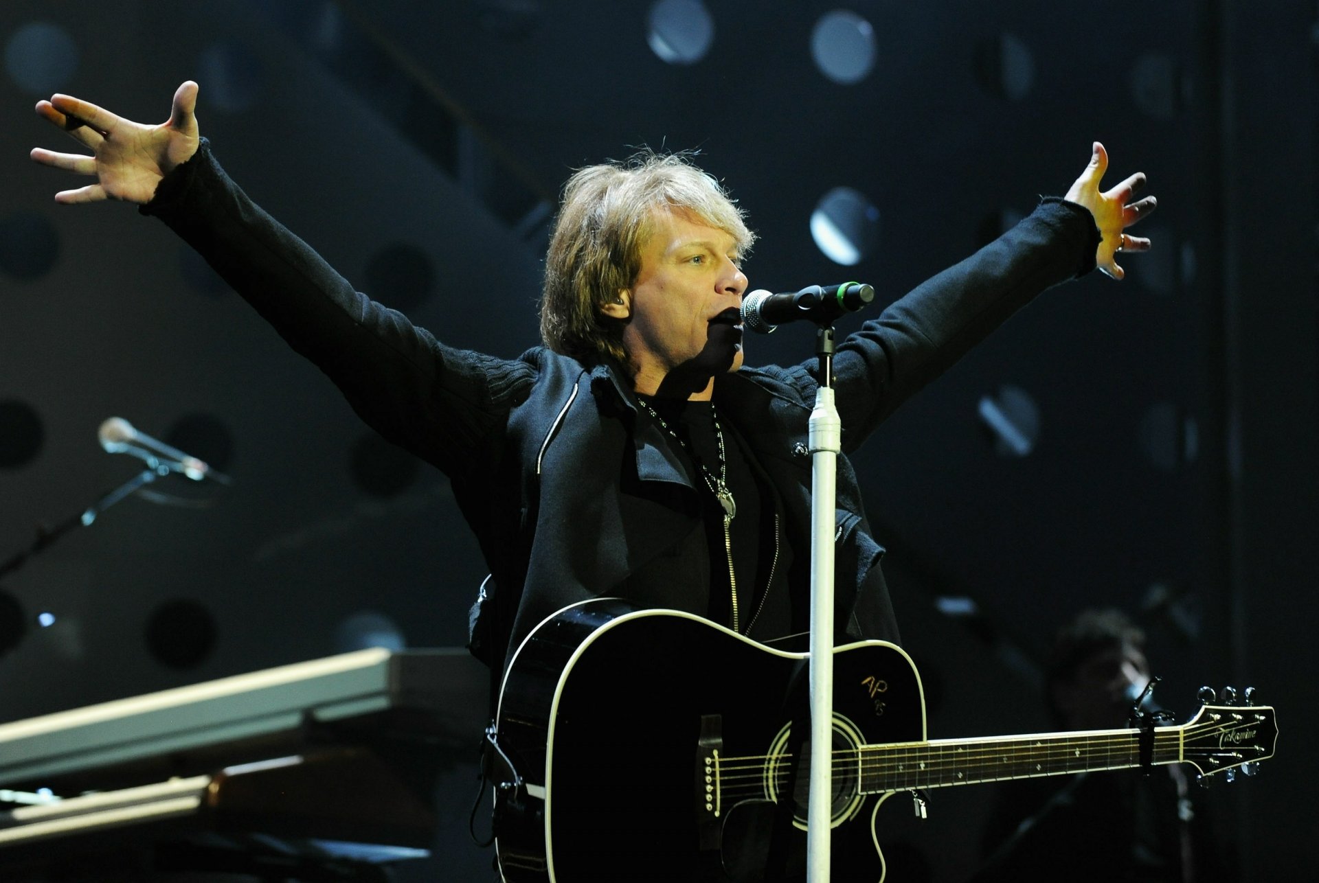 Un hombre con una guitarra canta en el escenario en el micrófono