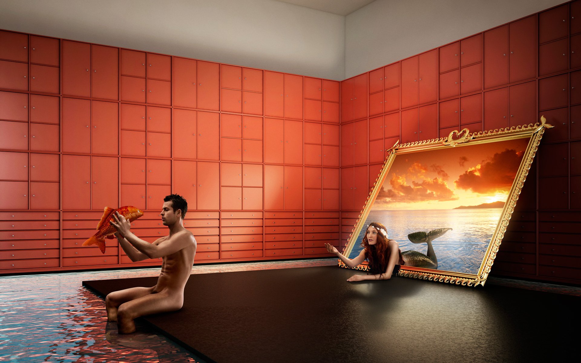 Sobre un fondo turquesa, un hombre con barba y gorra