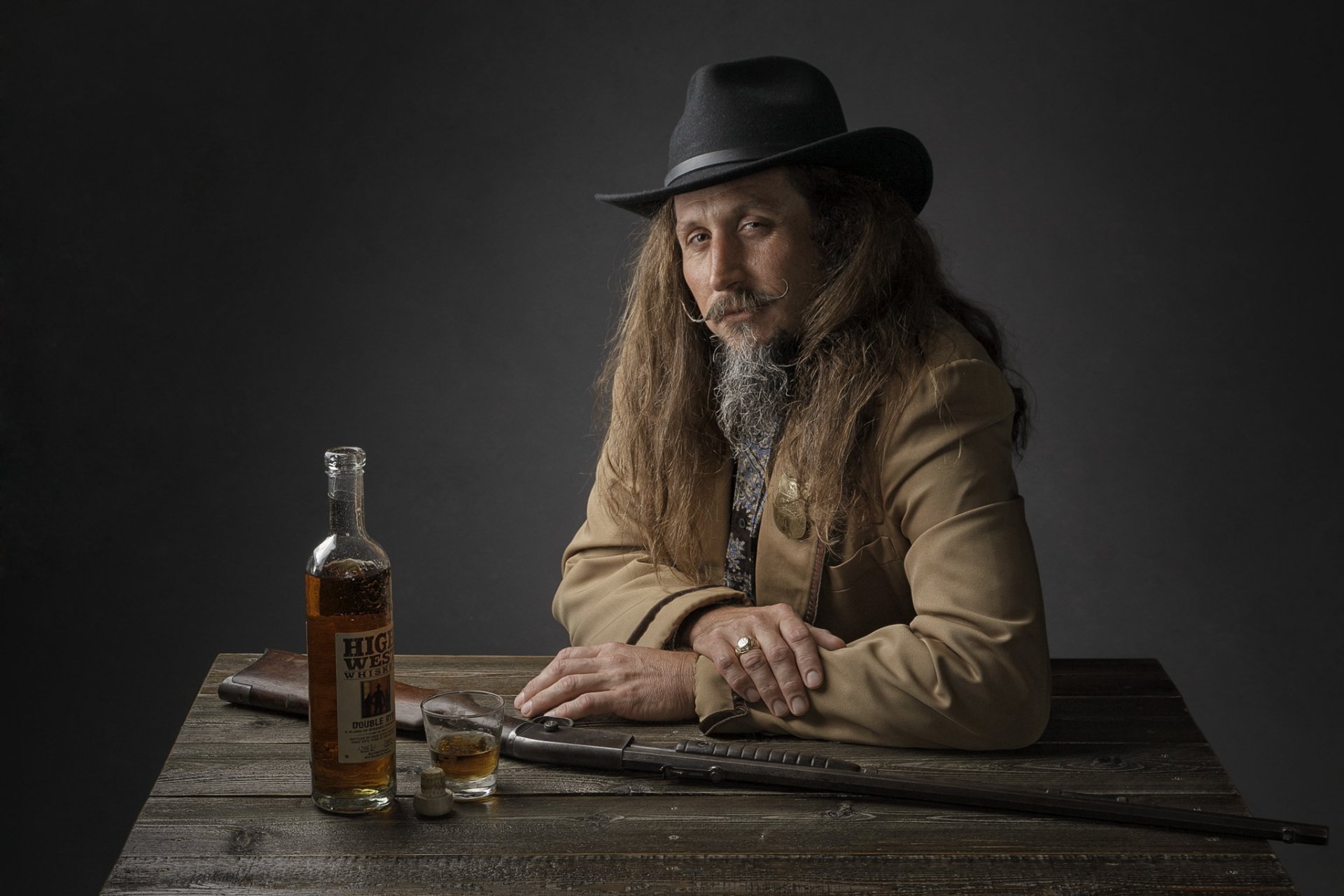 Un hombre de pelo largo con barba en un sombrero en la imagen de un vaquero se sienta en una mesa de madera, en la que hay una botella de whisky y un vaso medio lleno, y también hay un armaUn hombre de pelo largo con barba en un sombrero en la imagen de un vaquero se sienta en una mesa de madera, en la que hay una botella de whisky y un vaso medio lleno, y también hay un arma