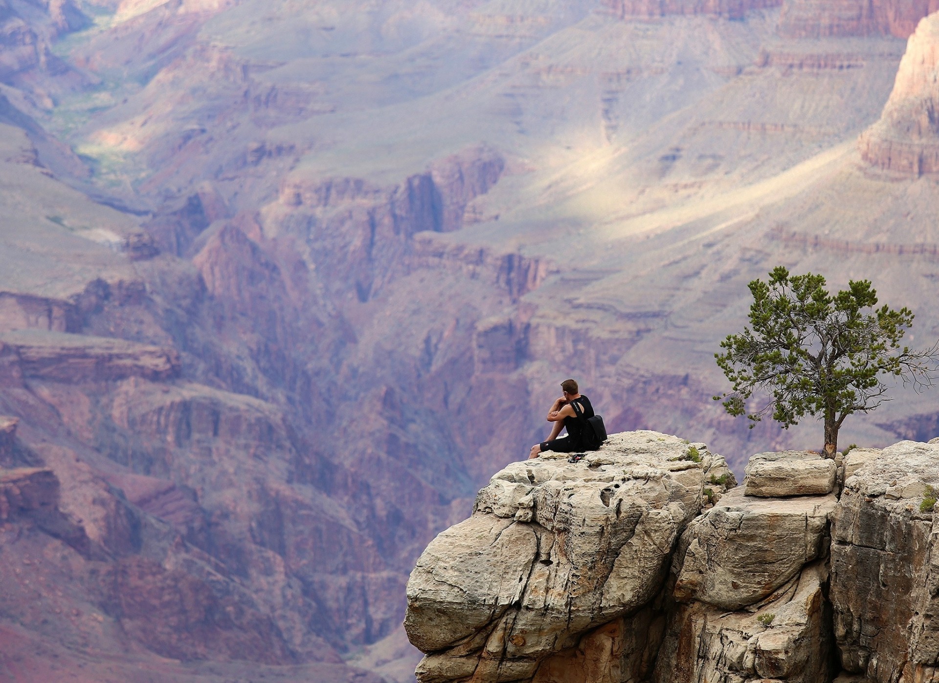 Hombre sentado en un acantilado en un hermoso cañónHombre sentado en un acantilado en un hermoso cañón