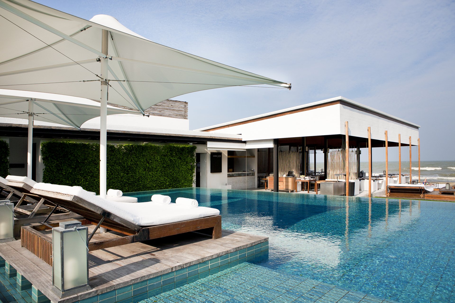 Vacaciones exóticas junto al mar con una relajante piscina en el hotel