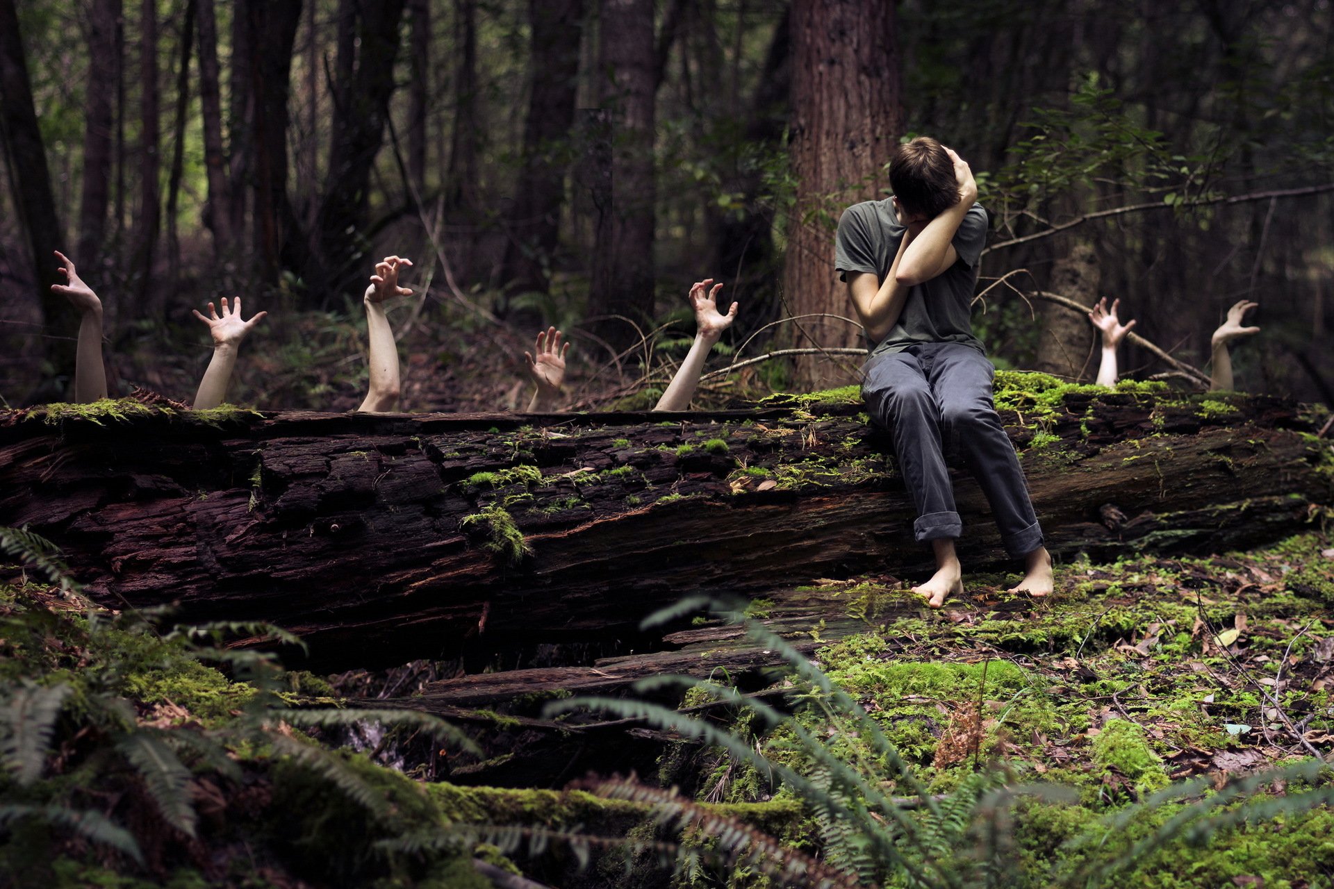 Hombre solitario en el bosque uno a uno con su miedoHombre solitario en el bosque uno a uno con su miedo