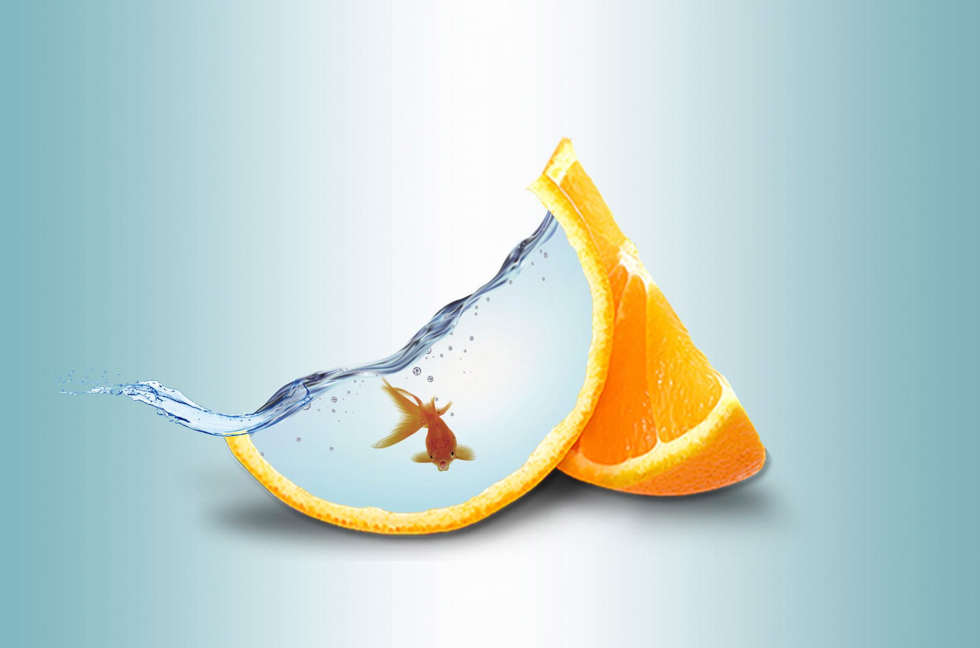Dos gajos de naranja con un pez dorado en uno de los gajosDos gajos de naranja con un pez dorado en uno de los gajos