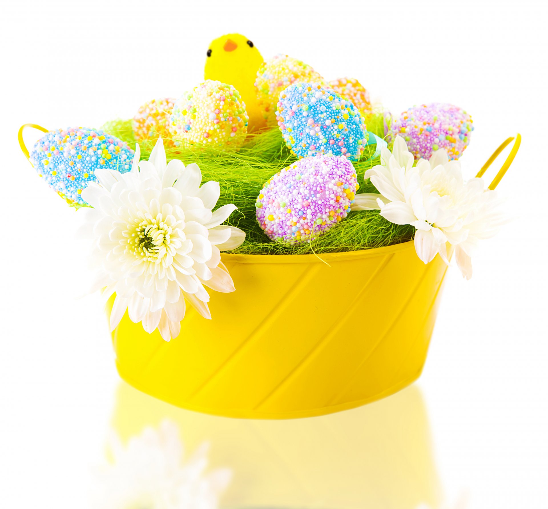 Huevos de Pascua pintados en una canasta sobre un fondo blanco