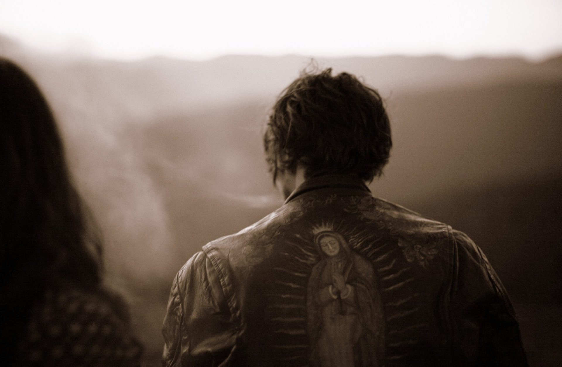 Mirar sin fin en la distancia en una chaqueta de cuero
