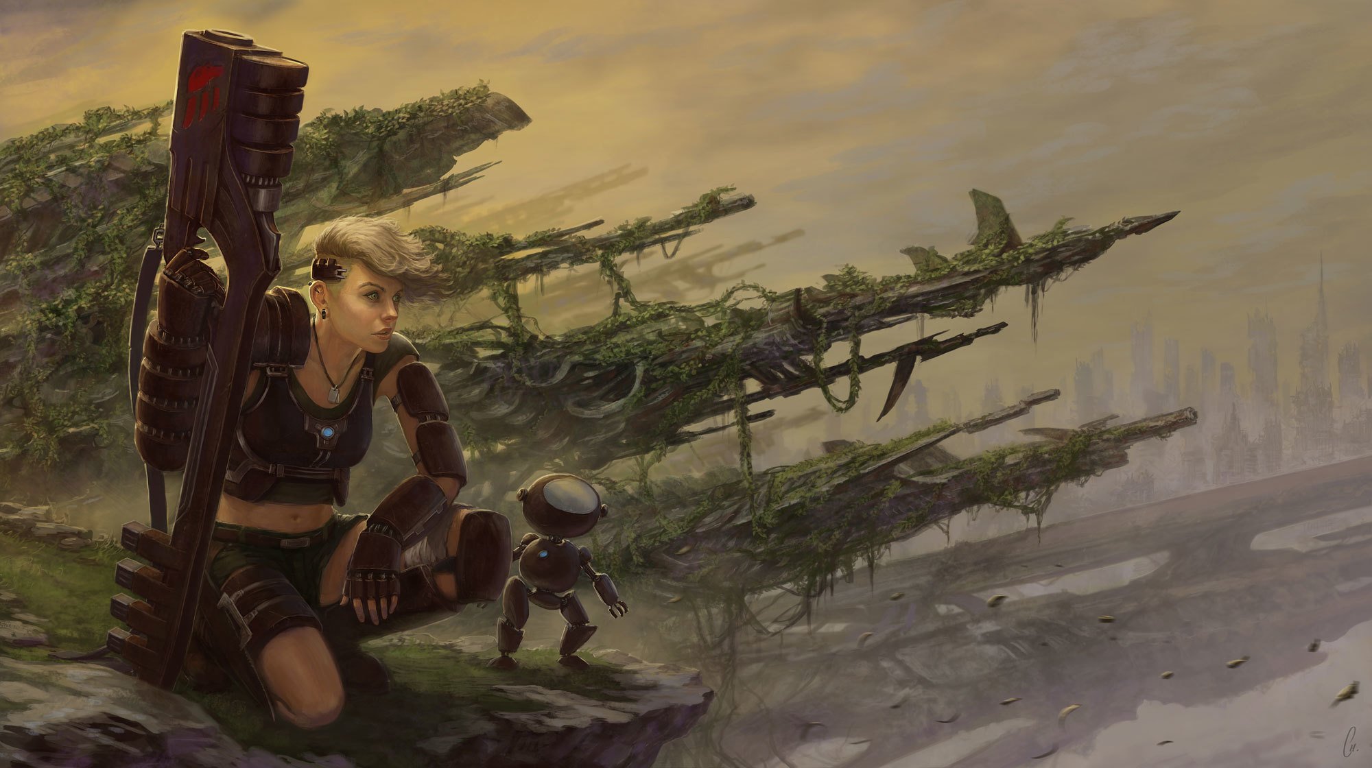 Post-apocalypse chica con un robot y un arma