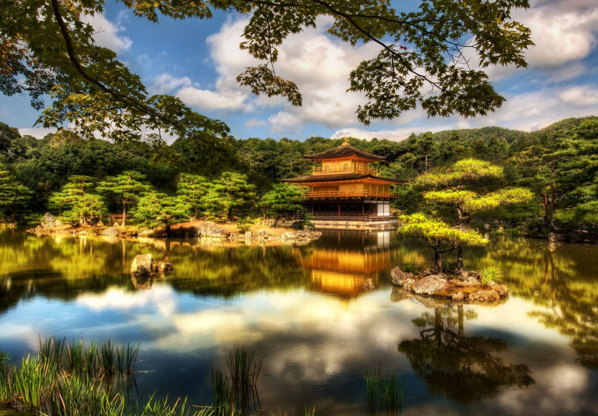 El oro de las pagodas del templo japonés se refleja en las aguas y las nubesEl oro de las pagodas del templo japonés se refleja en las aguas y las nubes