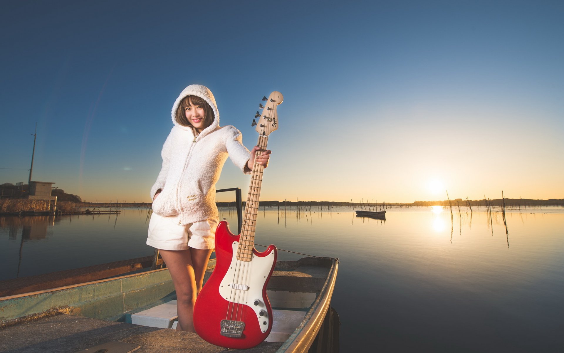 La chica con la guitarra roja en el fondo de la puesta de solLa chica con la guitarra roja en el fondo de la puesta de sol