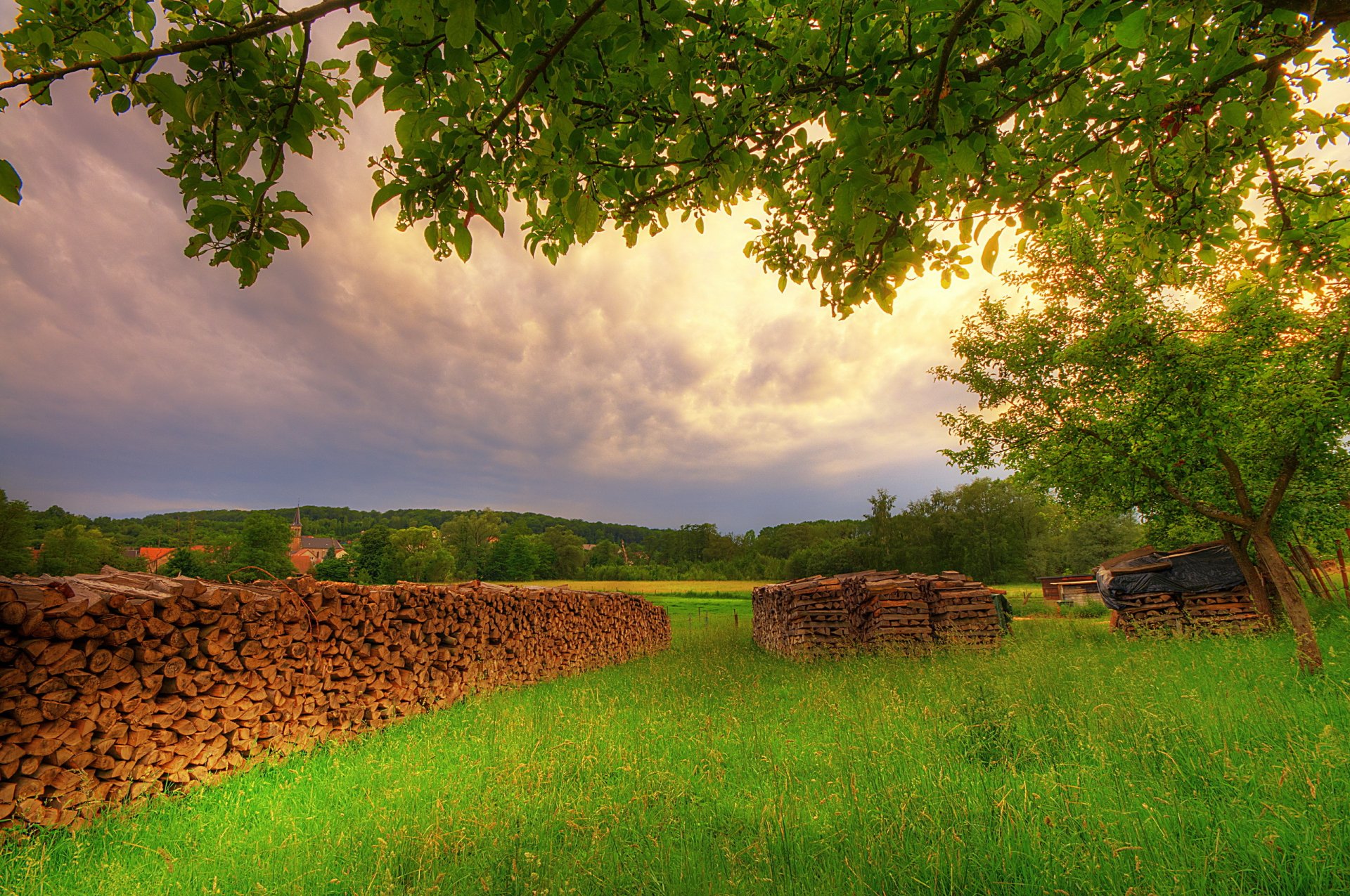 Leña en un claro verde en verano