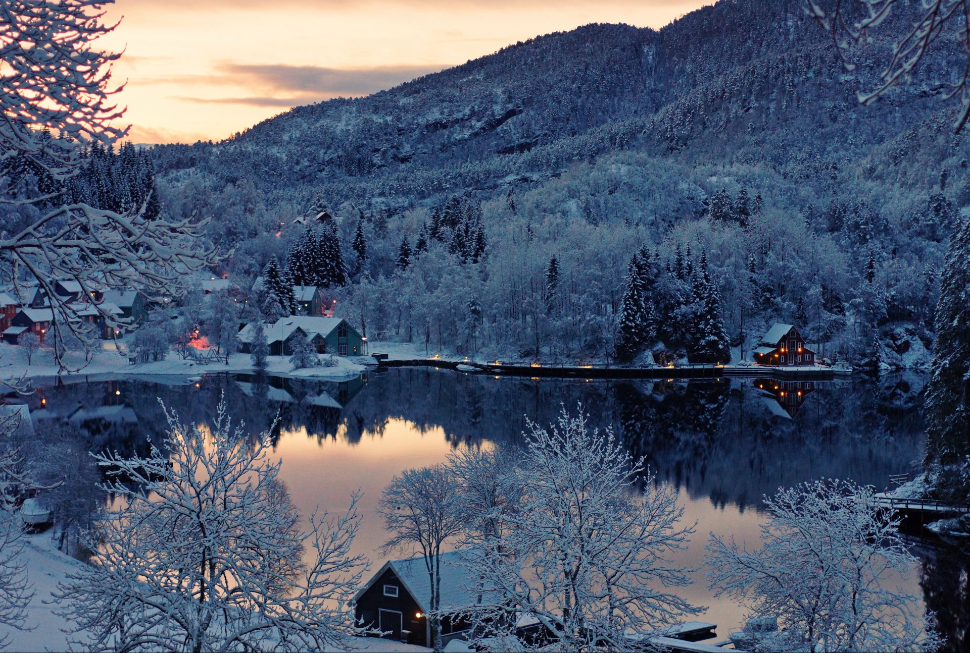 Casas en la nieve en el lago de Finlandia
