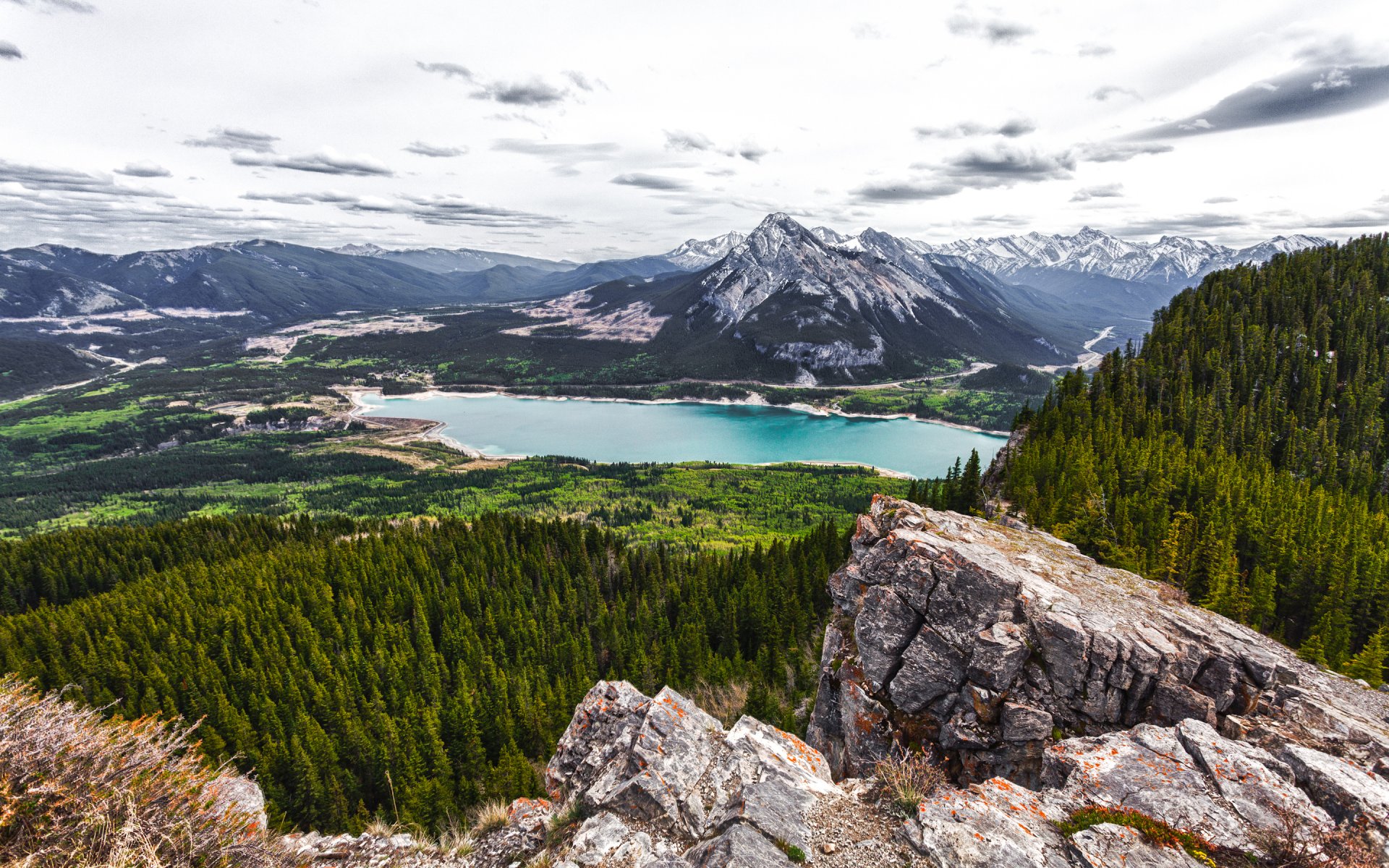 Un lago de montaña a lo largo de las orillas del cual crecen los árbolesUn lago de montaña a lo largo de las orillas del cual crecen los árboles
