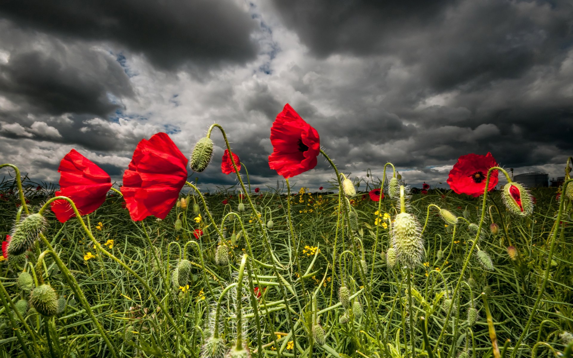 La naturaleza pasa por la tormenta. las flores de amapola se ruborizanLa naturaleza pasa por la tormenta. Las flores de amapola se ruborizan